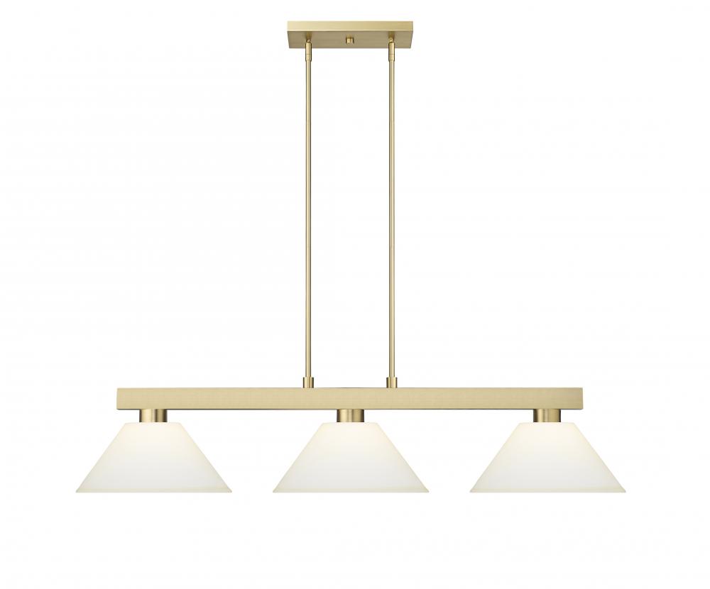 Elevate your game play with a modern three-light billiard light from the Cobalt collection. Its suspension framework and vertical hanging bar receive a timeless modern gold finish thats warm and inviting, perfect for lounging with the family or entertaining friends. Three lights are shaded in glass with a matte opal finish, offering soft, diffused illumination perfect for myriad games and activities.
