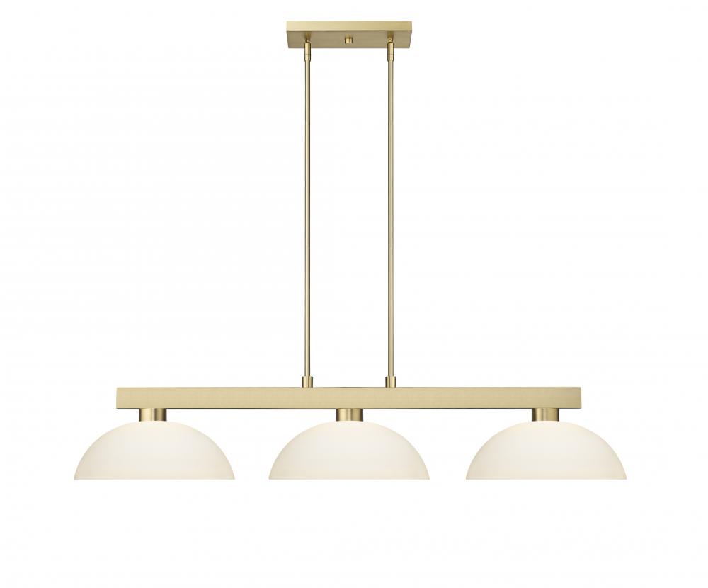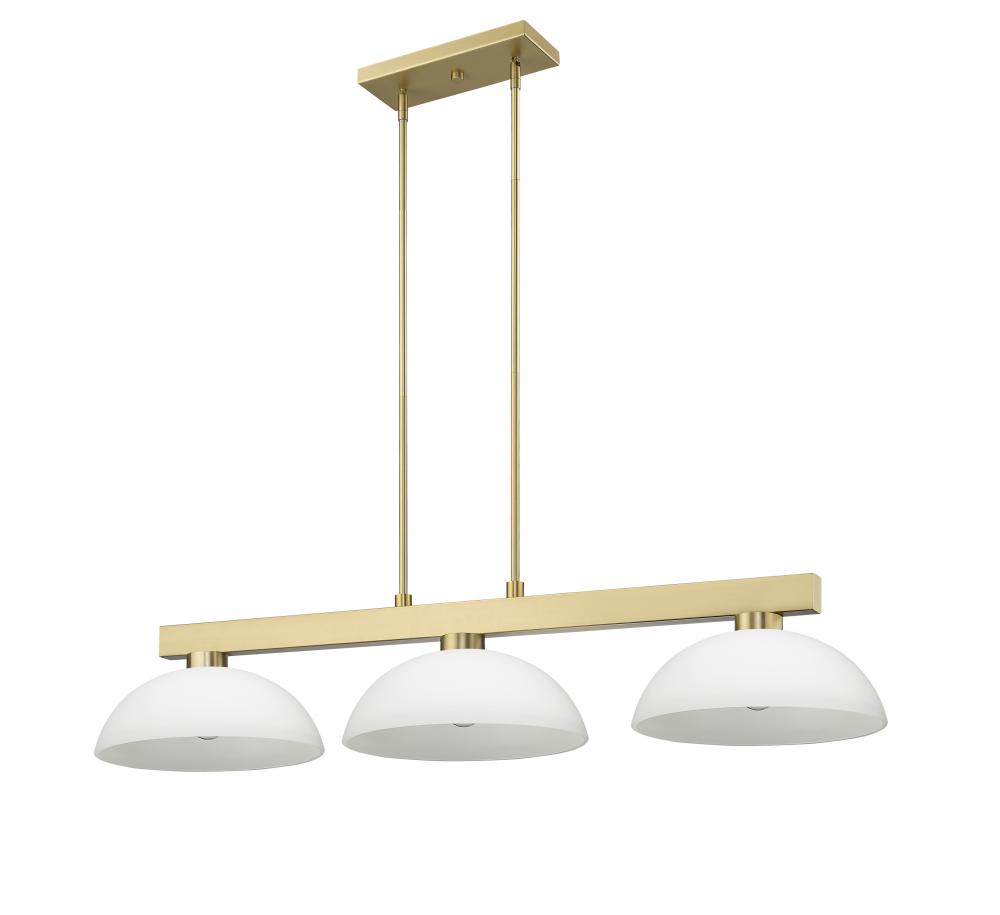 Put the finishing touches on your home entertainment space with a modern three-light billiards light with a linear profile. Its classic design pairs a modern gold finish framework with clean lines and rounded dome shades made from glass in a matte opal finish.