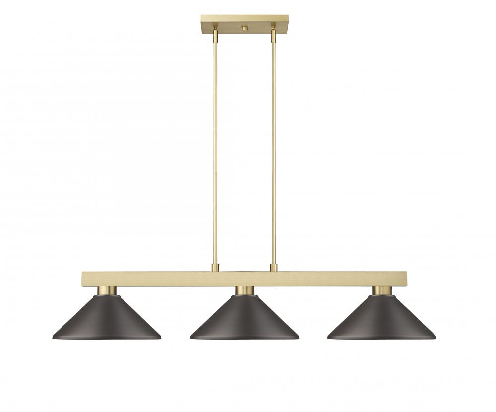 Conical metal shades bring classic ambiance to a modern three-light billiards light. Its clean-lined frame is perfect over a pool table or gaming space, featuring a modern gold finish that pairs perfectly with the rich bronze of its shades. From the Cobalt collection, it offers bright illumination for all types of entertainment pursuits.