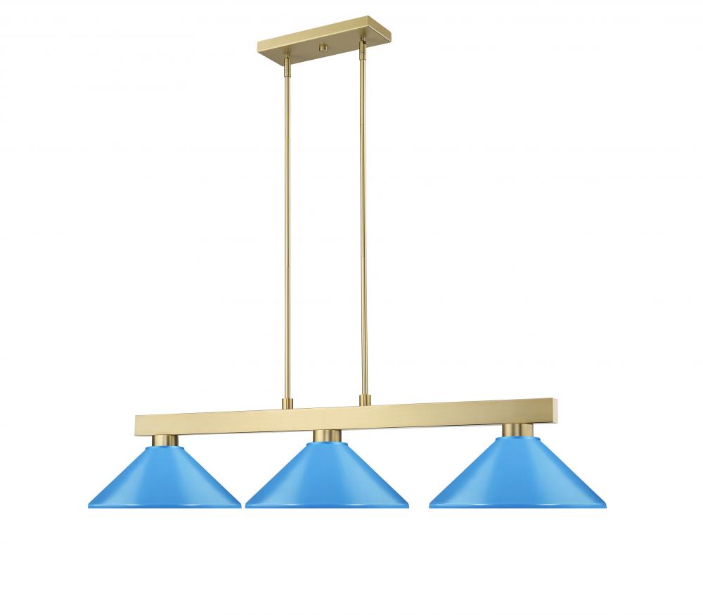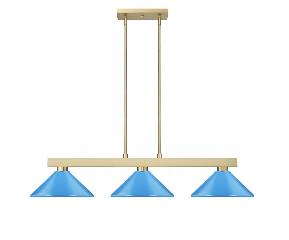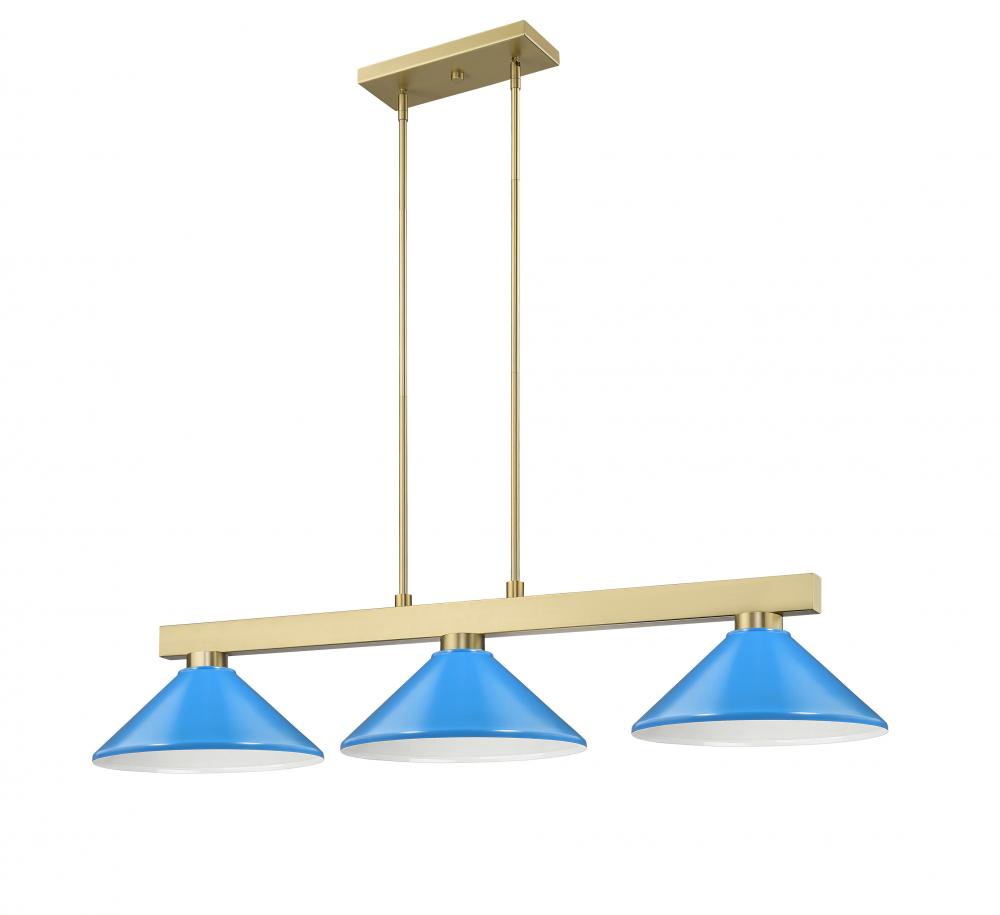 Conical metal shades bring classic ambiance to a modern three-light billiards light. Its clean-lined frame is perfect over a pool table or gaming space, featuring a modern gold finish that pairs perfectly with the electric blue of its shades. From the Cobalt collection, it offers bright illumination for all types of entertainment pursuits.
