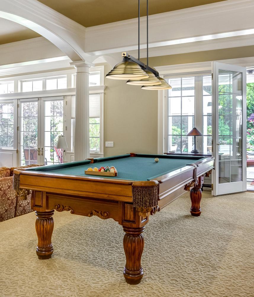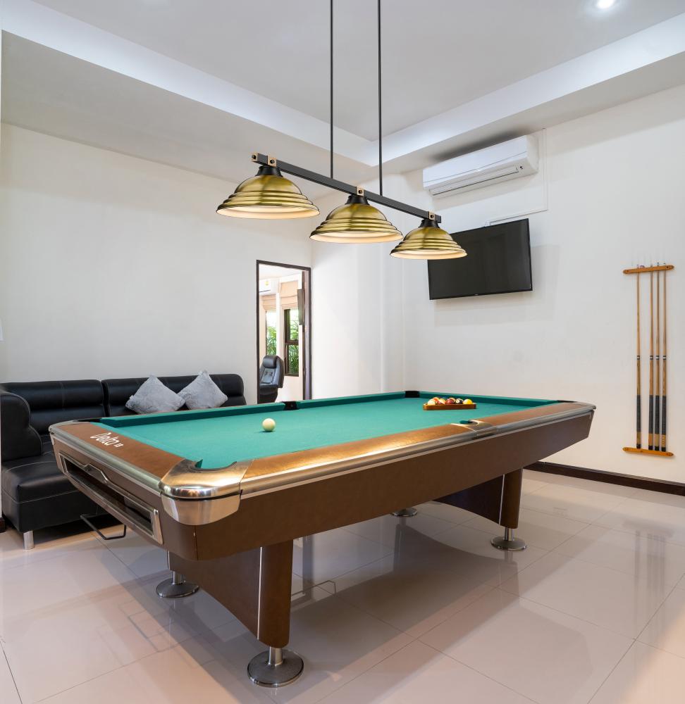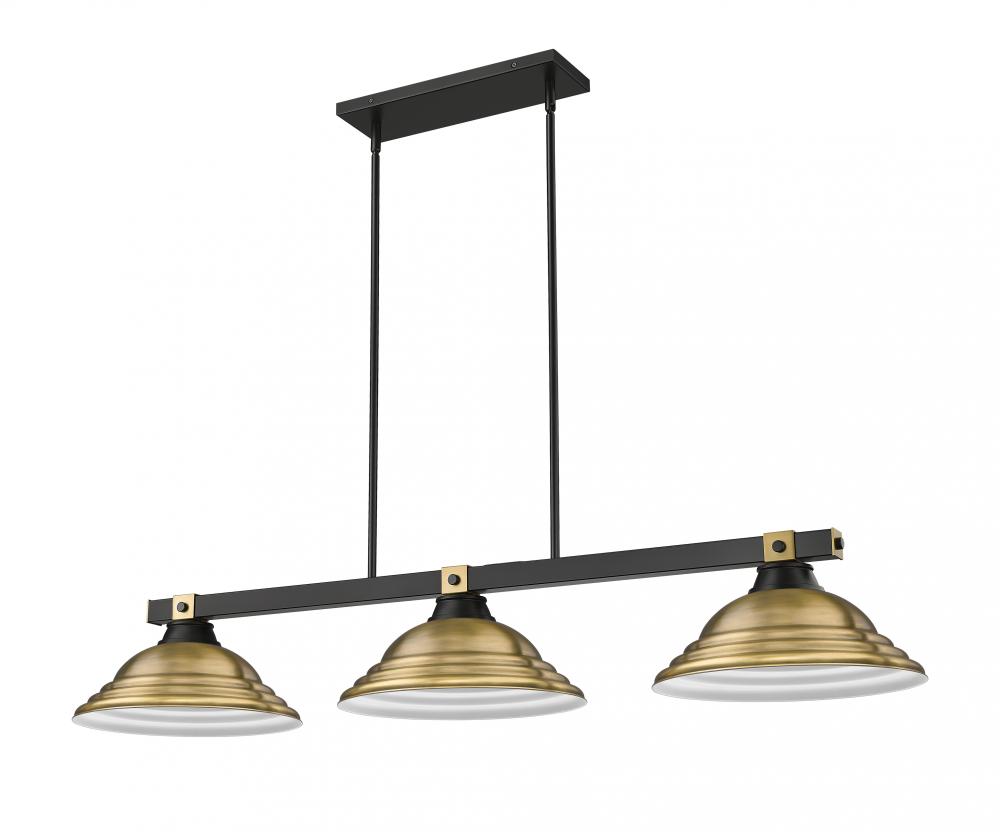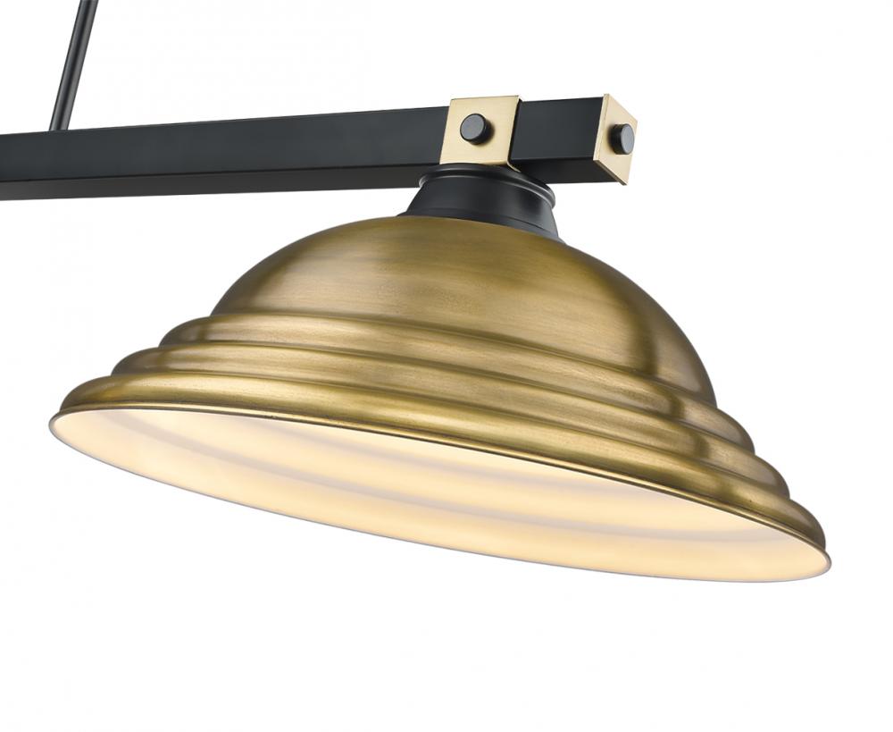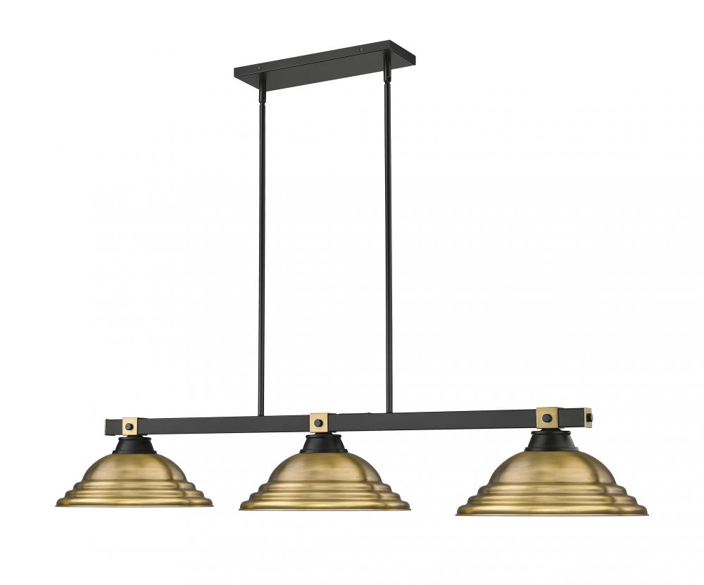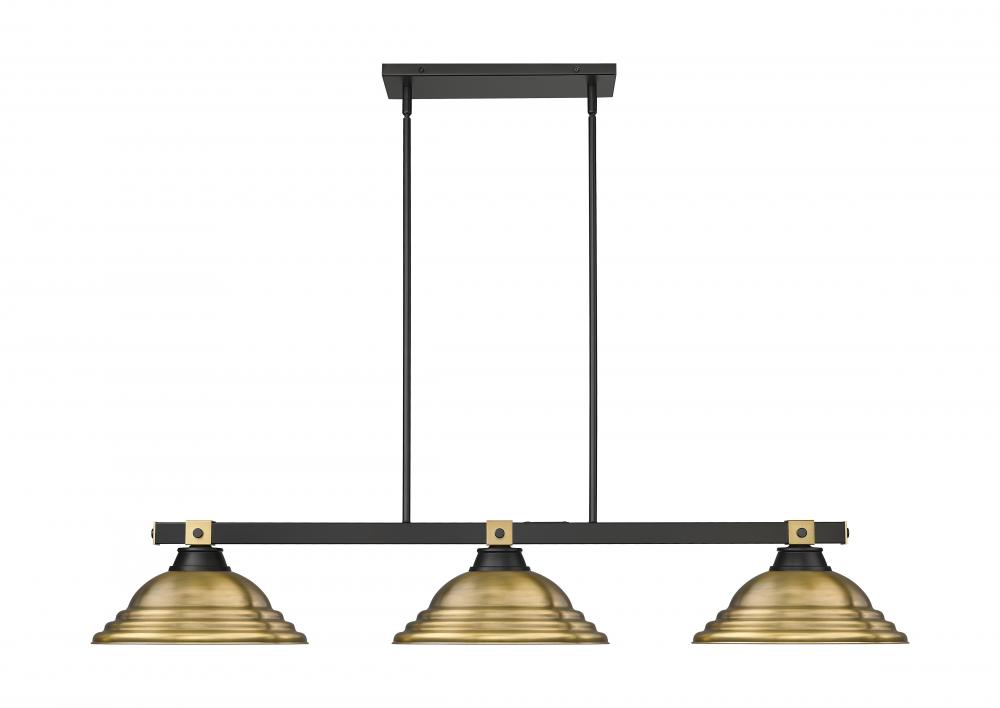 Rubbed brass brings sophisticated warmth and refinement to this modern three-light billiards pendant. It features a streamlined structure with a matte black finish, creating contrast and depth over a gaming or dining table. Shades are a familiar silhouette with delicate stepping that creates impressive texture.