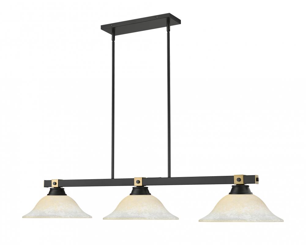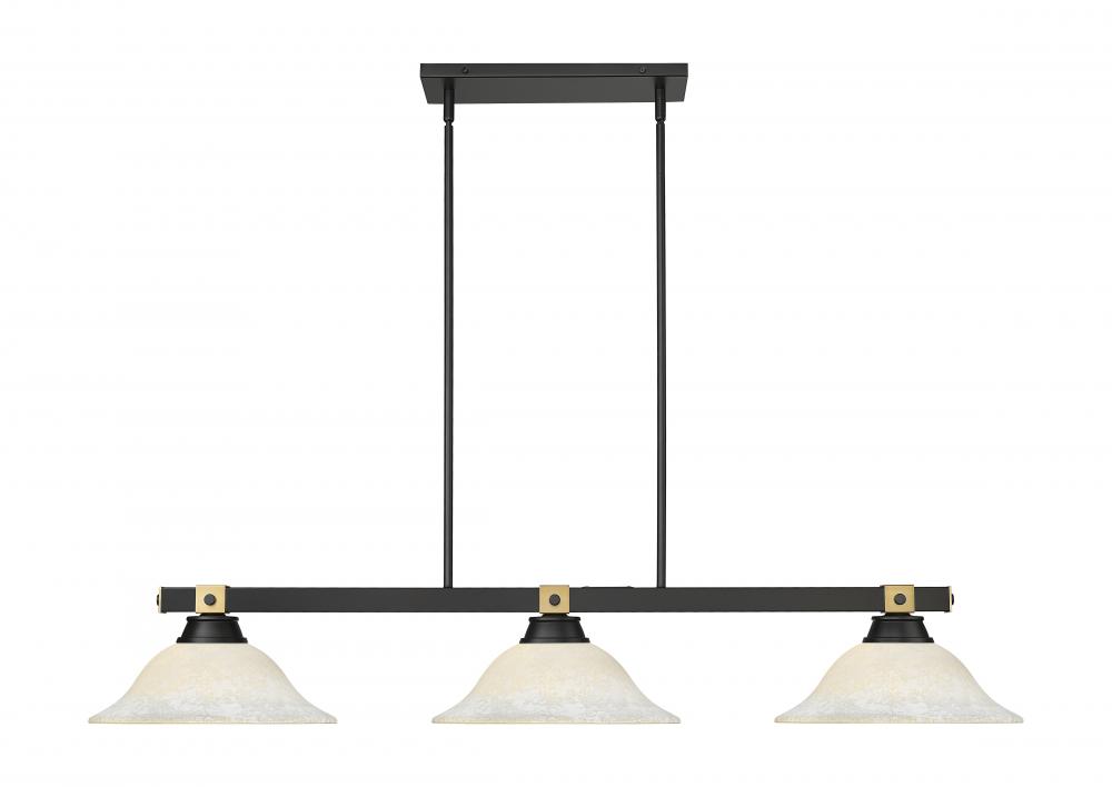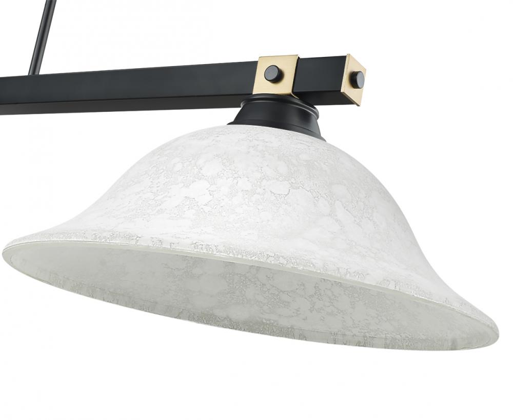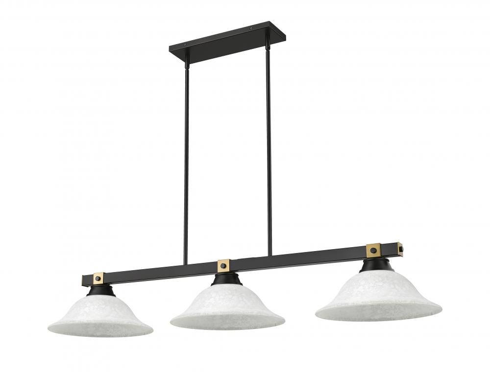 Augment your favorite space with the linear silhouette of a modern three-light billiards pendant. It pairs a matte black finish with white shades that add a delicate stepped detail for added texture and depth. Rubbed brass embellishments are a chic finishing touch.