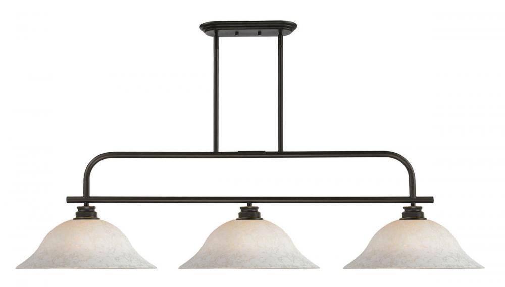 Finished in olde bronze this vintage three light fixture is paired with white mottle glass shades to compliment any d?cor. The simple vintage styling of this fixture would be perfect for the game room, or any other room of the house where a touch of vintage class is needed.