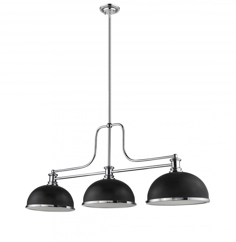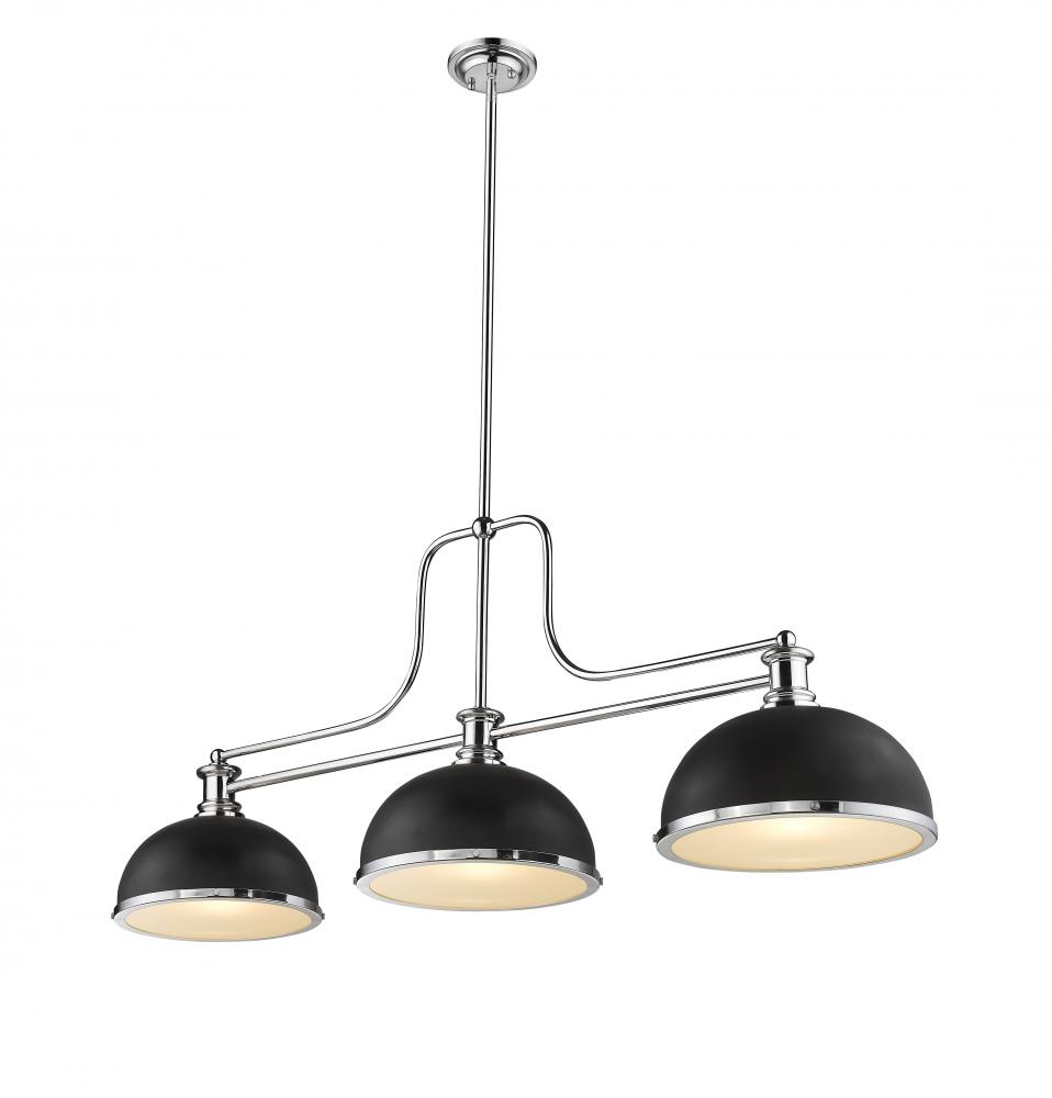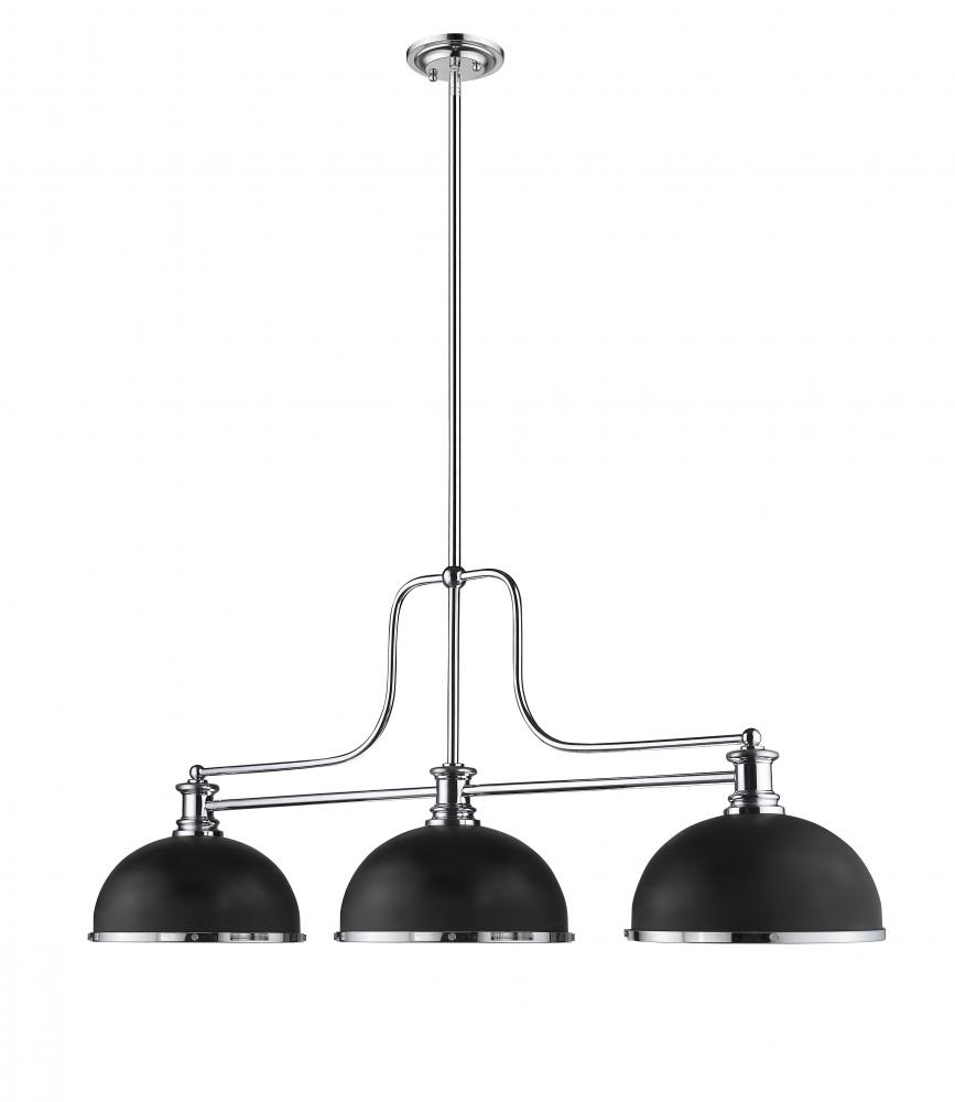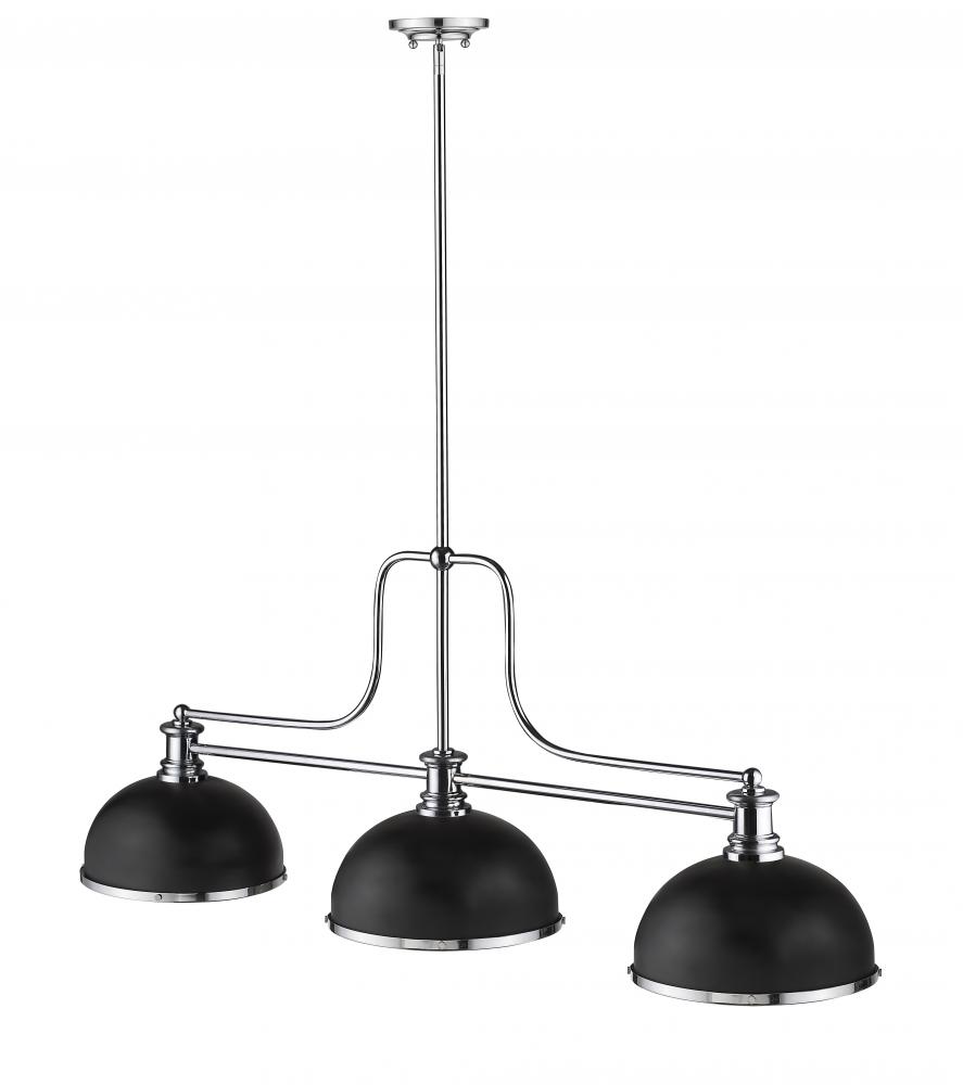 Sleek finishes in matte black and chrome add contrast and sophistication to make this fixture a great choice for a transitional spot. Make this three-light pendant an artistic addition to a stylish custom space.