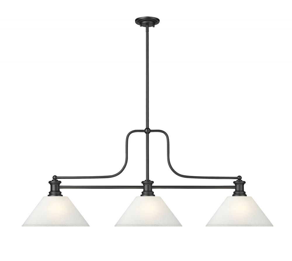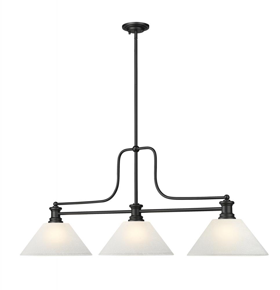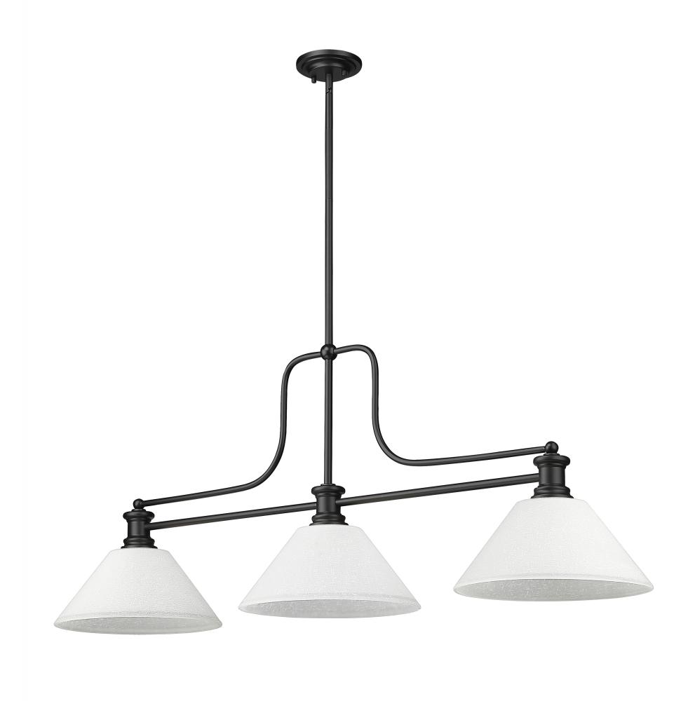 Iconic transitional fare replicates the conventional feel of billiards illumination as this artful and enticing three-light billiards light from the M?lange collection by Z-Lite stands out. A simple yet fluid silhouette blends matte black steel and white linen glass shades forming a perfectly balanced profile. Choose this fixture for highlighting a kitchen island or sports room billiard space.