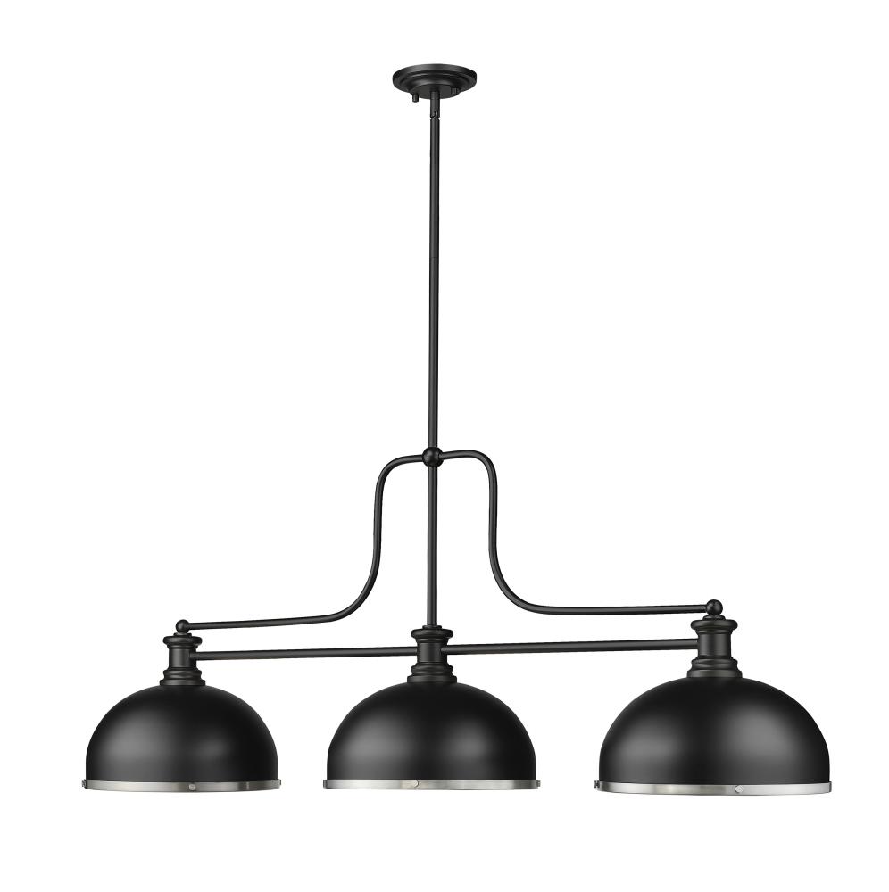A subtle industrial vibe and matte black and brushed nickel finish pairing flatter this three-light billiards pendant from the M?lange collection by Z-Lite. A simple yet fluid silhouette blends matte black steel and matching dome-shaped steel shades complemented with brushed nickel banding, forming a perfectly balanced profile. This charming fixture is an ideal solution to brighten a kitchen island or sports room billiard space.