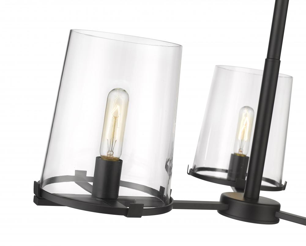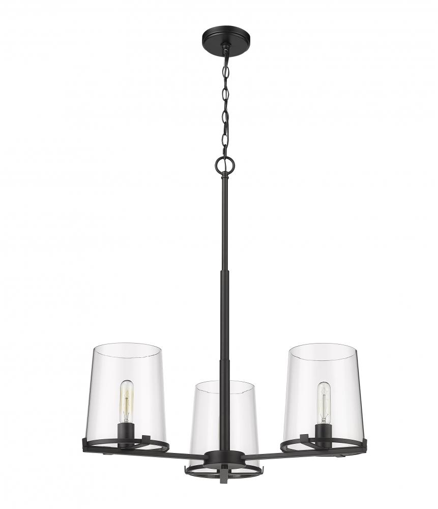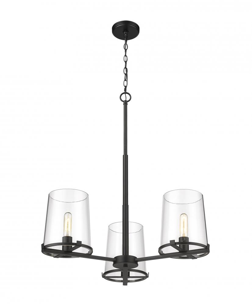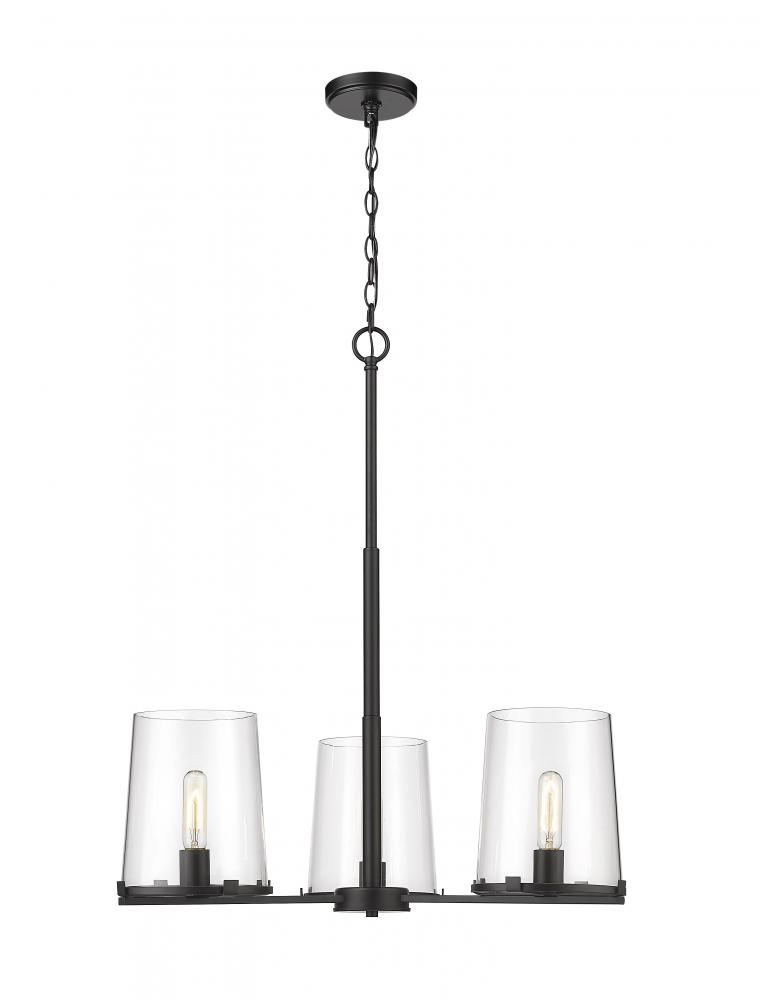 Sophisticated artistry borrows from a blend of village and nautical to craft the Callista three-light chandelier and create a focal point in a custom dining or living space. This tasteful fixture mixes matte black finish steel in a hand-crafted frame with three ring bases and a suspension rod, as tapered clear glass shades deliver stunning contrast.