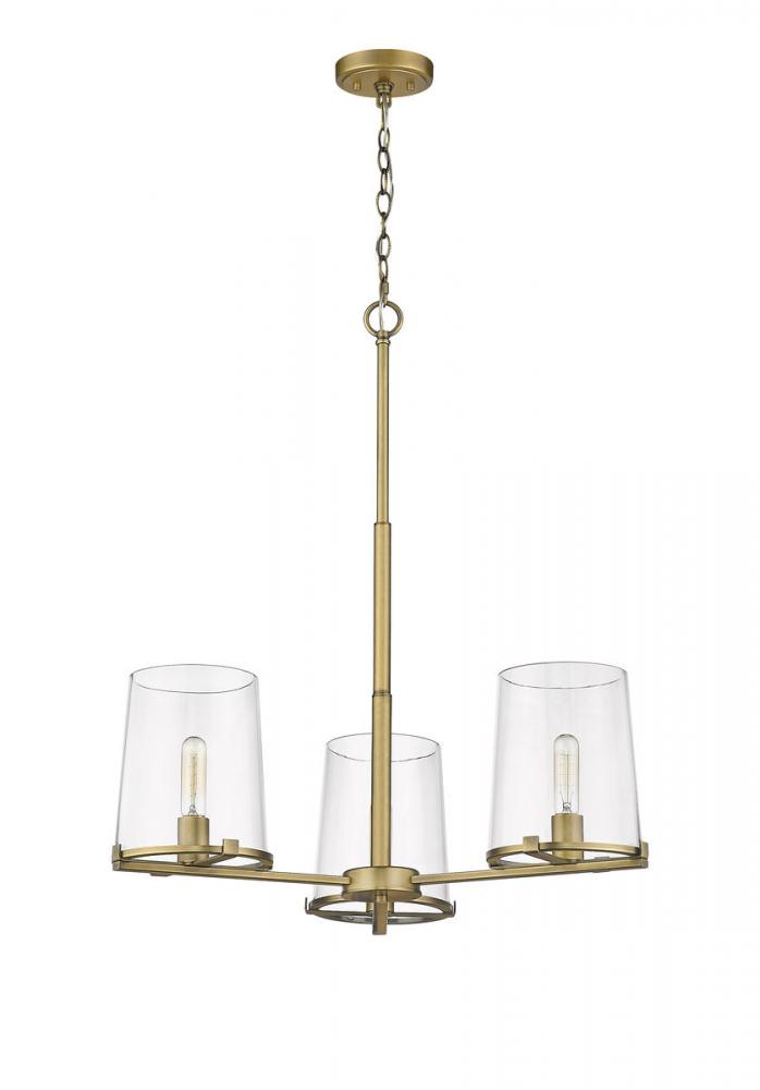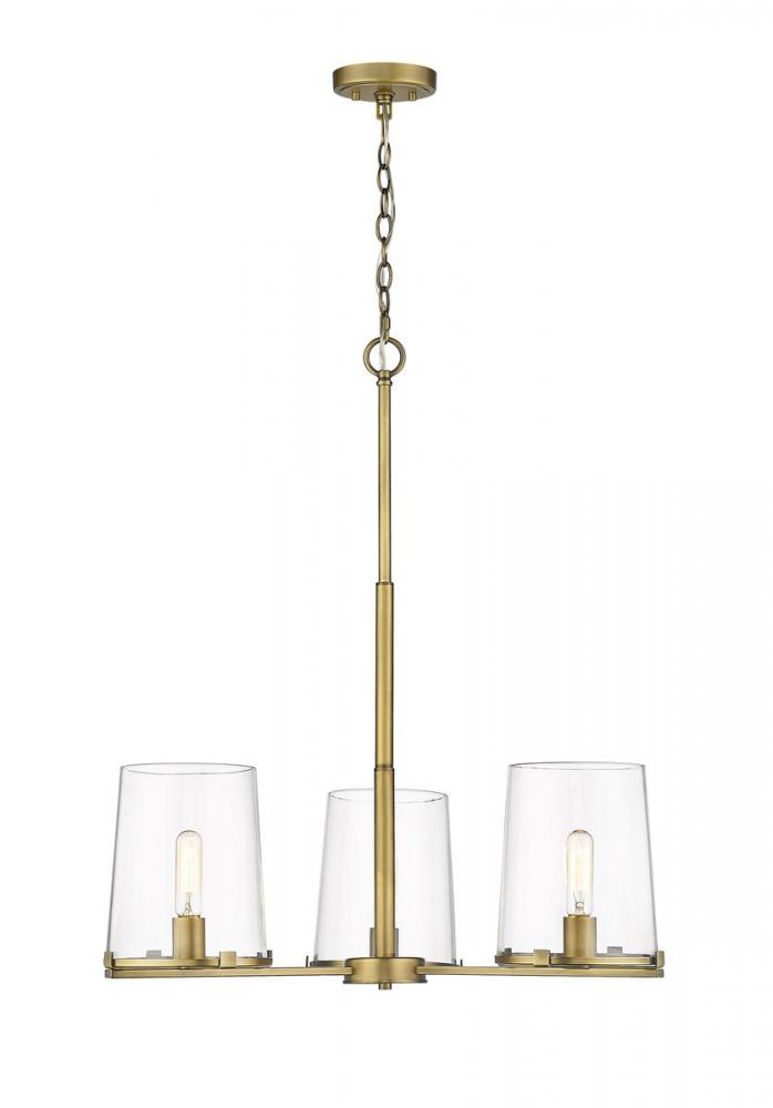 Add character, dimension, and bright ambiance to transitional dining room d?cor. This rubbed brass finish chandelier features a sleek, steel frame with three clear glass shades for an effortlessly elegant glow.