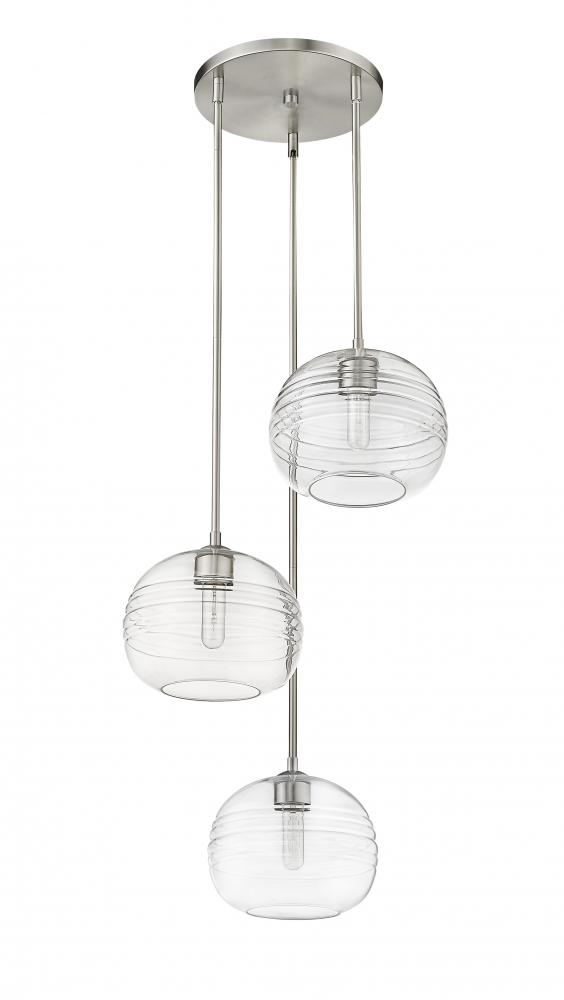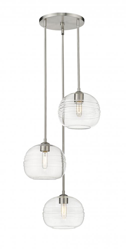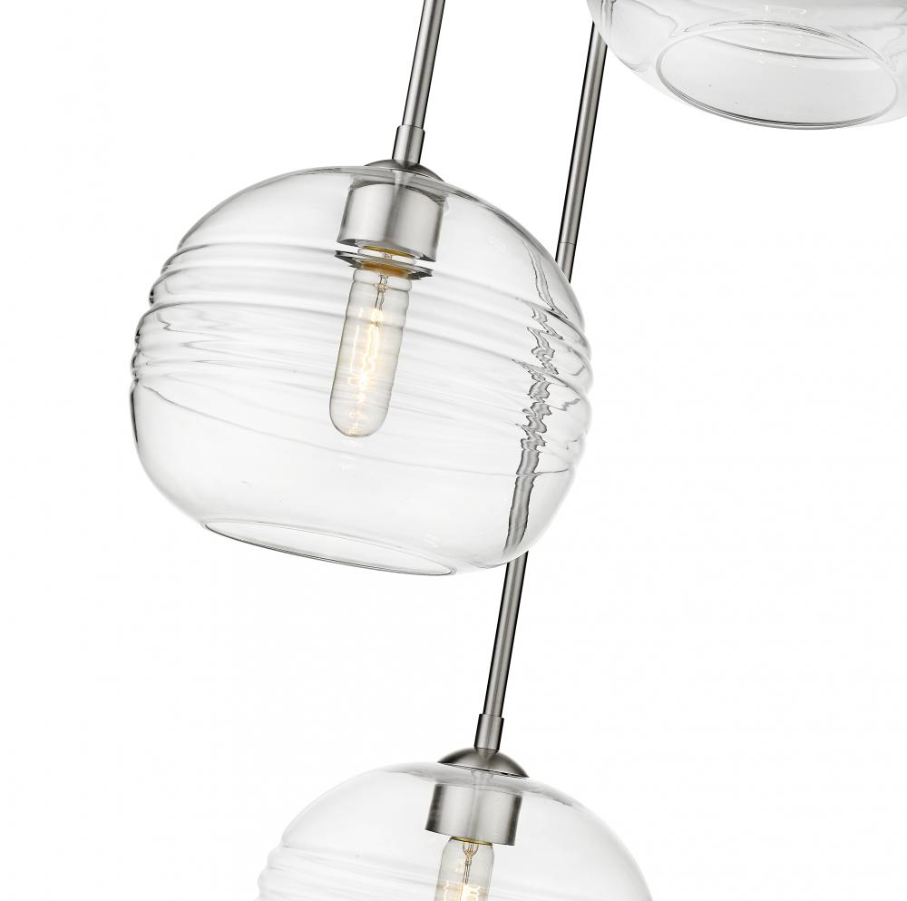 Express your modern aesthetic with this eye-catching three-light pendant. Grooved, rounded shades are made from clear glass, suspended from a sleek steel frame with a brushed nickel finish. The fixture brings a chic cutting edge to a contemporary kitchen or dining room.