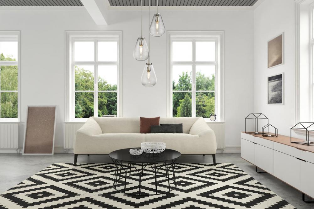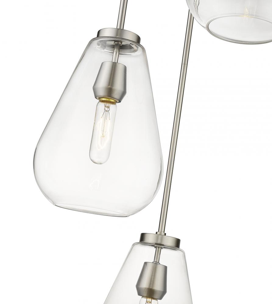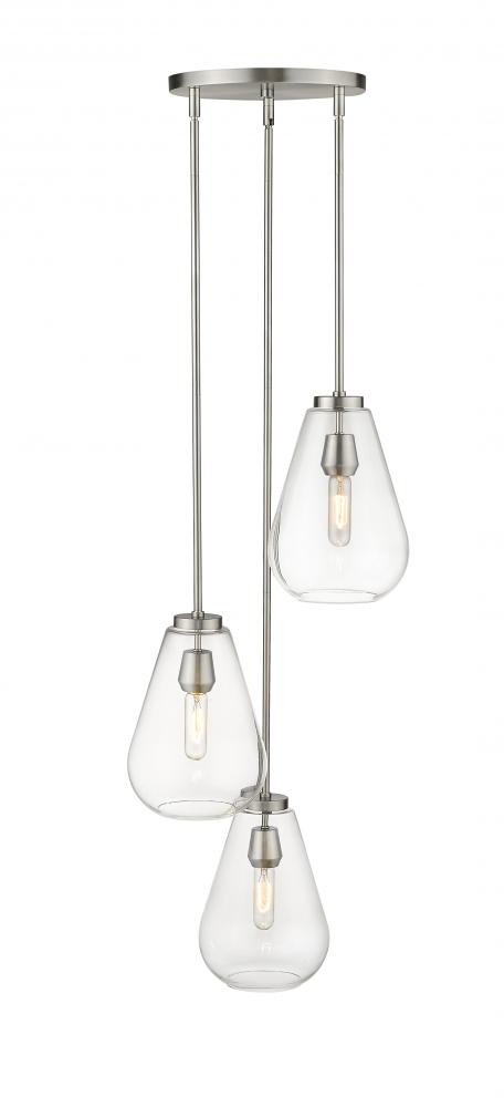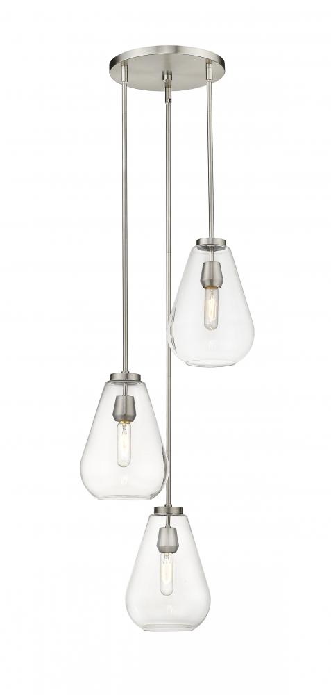 An eye-catching three-light pendant perfectly encapsulates the modern aesthetic. Tapered bell-shaped shades are made from clear glass, suspended from a sleek steel frame with a brushed nickel finish. The fixture brings a chic cutting edge to a contemporary kitchen or dining room.