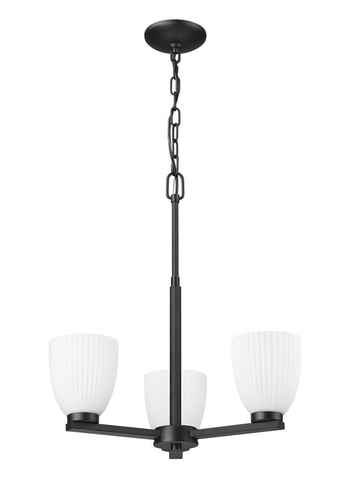 Framed in a matte black finish and glowing with matte opal glass, this three-light chandelier brings sculptural presence to any space. Ribbed opal shades diffuse the light with quiet elegance, creating a soft and balanced ambiance. It?s a refined focal point that anchors the room with effortless style.