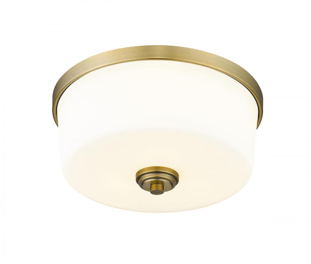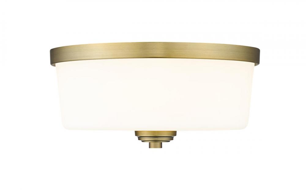 Light up a contemporary kitchen, dining space, or main living area with this sophisticated three-bulb flushmount ceiling light. A deep round shade is fashioned of matte opal glass, pairing beautifully with heritage brass finish metal accenting.