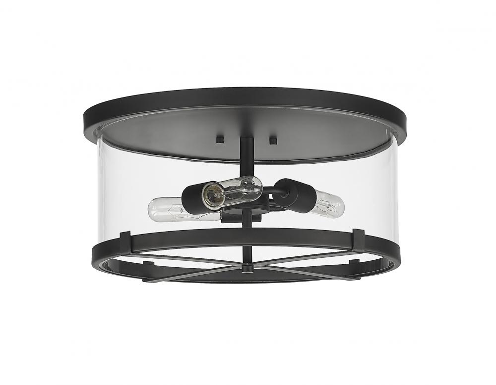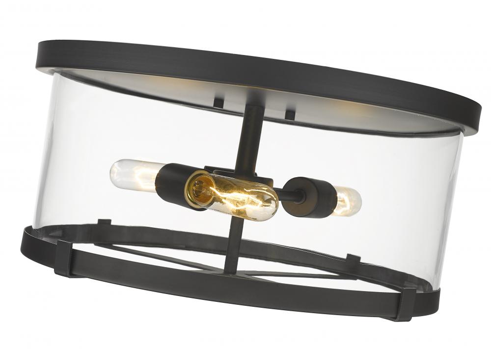 A bold design satisfies thirst for indulgent accenting in transitional lighting, and the Callista three-light flush mount ceiling light delivers. This intriguing light features a mix of village and industrial aesthetics with its hand-crafted matte black finish, round steel frame and clear glass shade that prop up full view of charming bulb mounts meant to be seen.