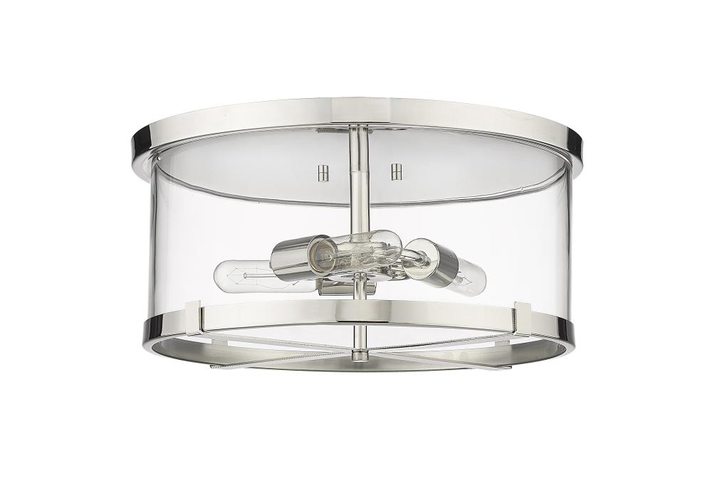 Radiance and light essence combine to bring an indulgent glam to any modern or transitional space with the Callista three-light flush mount ceiling light. This intriguing light features a mix of village and industrial aesthetics with its hand-crafted polished nickel finish steel frame and clear glass shade that prop up full view of charming bulb mounts meant to be seen.