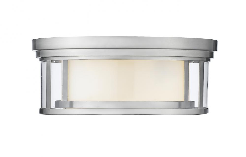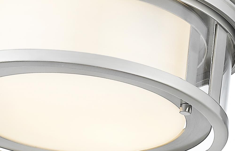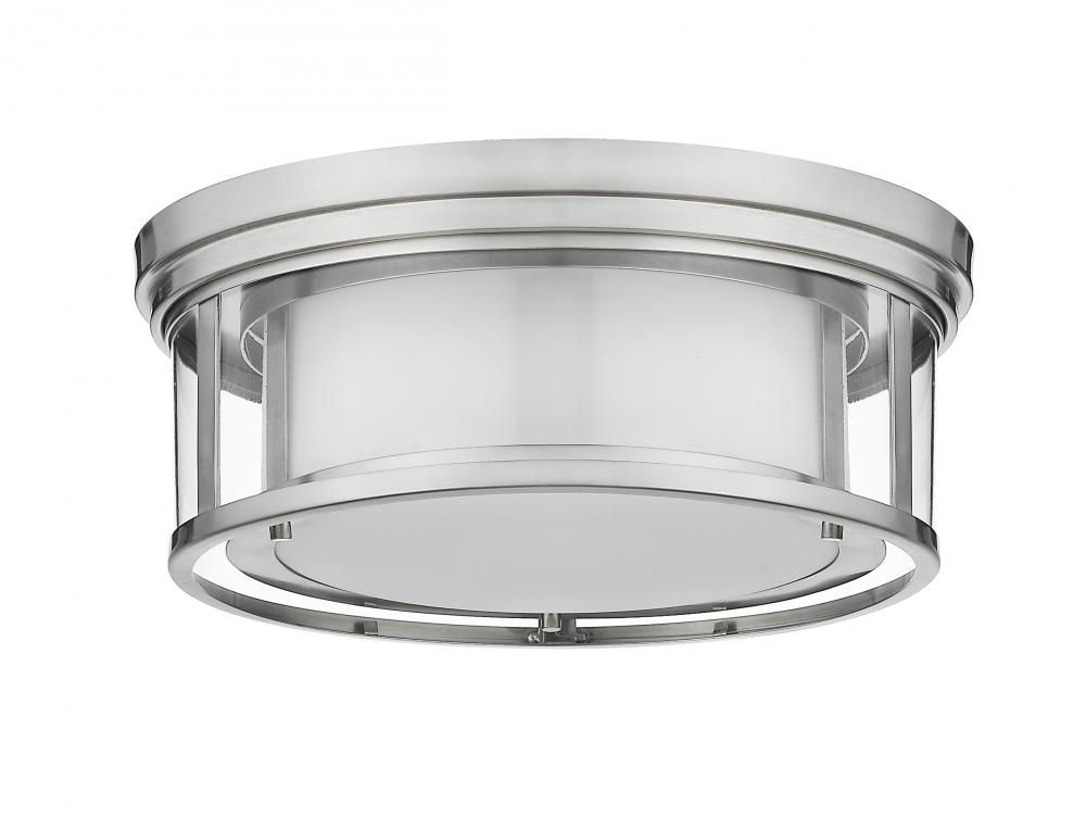 Give your dining room or bedroom a chic, sophisticated update. This beautiful, brushed nickel flush mount ceiling fixture features three glowing bulbs beneath a delicate, glass shade thats white on the inside and clear on the outside. An exquisite lighting option to highlight your refined sense of style.