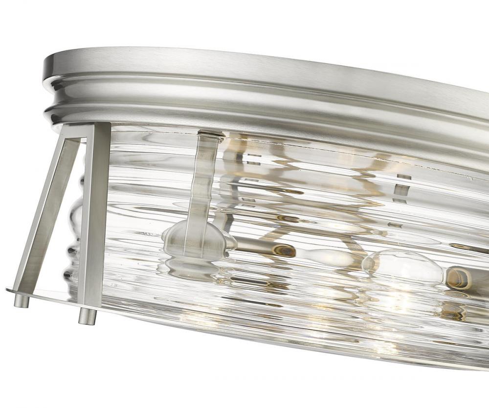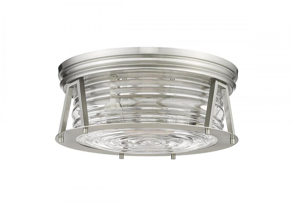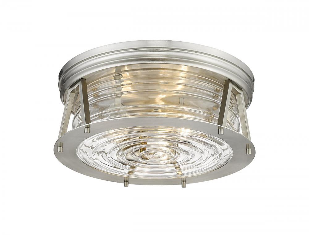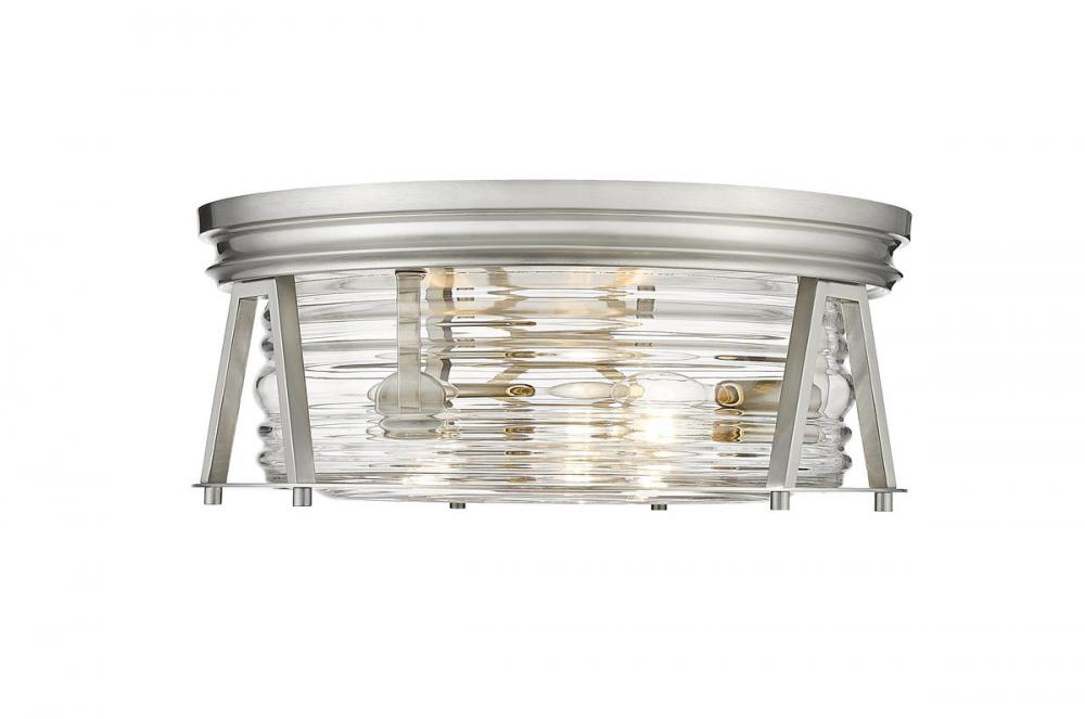 Chic lighting illuminates a custom space with decadence and a hint of nautical fare, customizing this brushed nickel and glass three-light flushmount ceiling light. Embrace a historical theme originating from storied lighthouse designs with this light from the Cape Harbor collection, enjoying versatility that embellishes a space with modern, industrial, and Art Deco ambiance. This light offers a sleek ribbed clear glass shade nestled in a linear frame fashioned of brushed nickel finish steel.