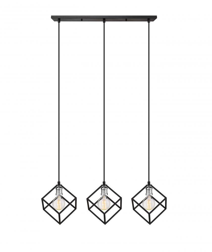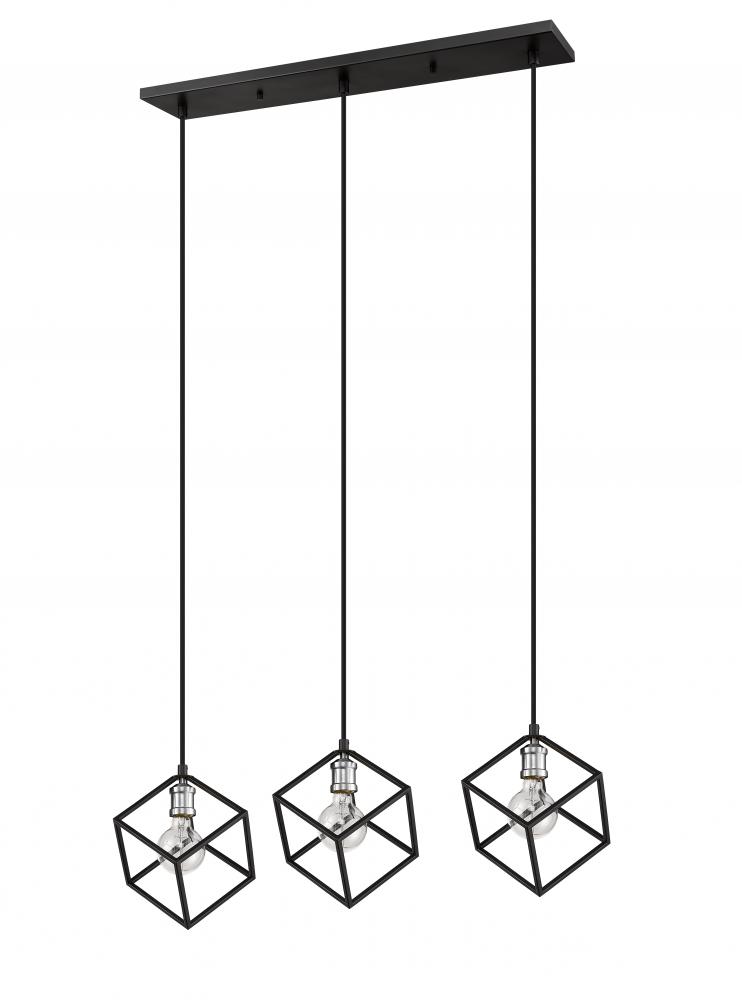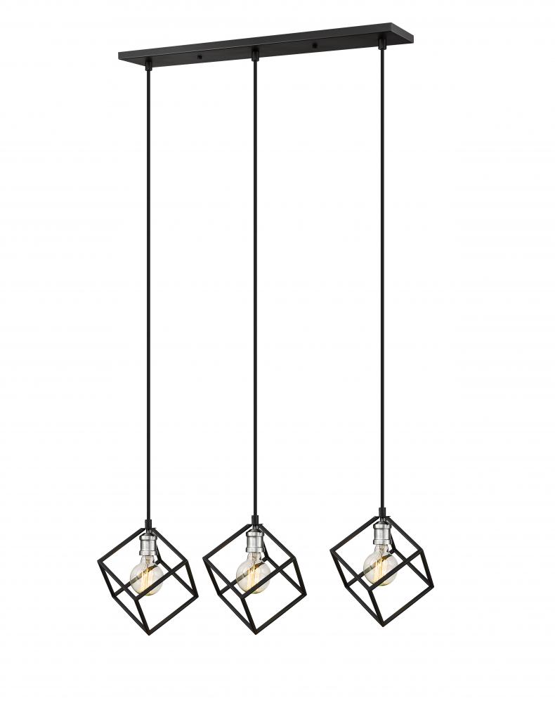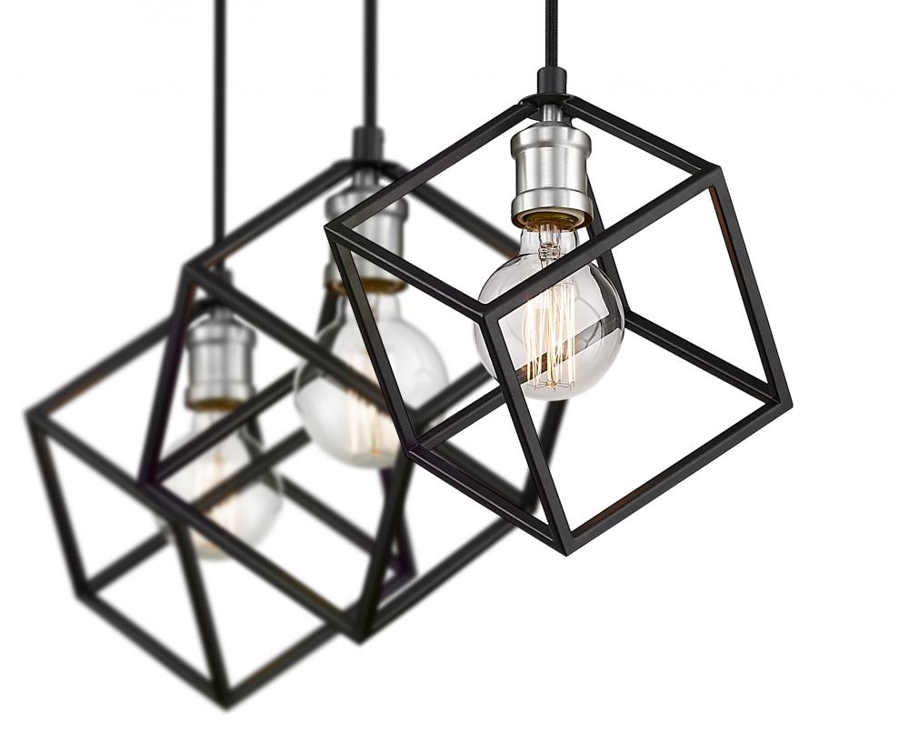 Clean lines and an eclectic modern design highlight this two-tone three-light island/billiard light for your home. Its fashioned in a matte black and brushed nickel finish with cube-shaped shades for a look thats contemporary yet timeless. Its a design that catches the eye in any dining room, foyer, or entertainment room.
