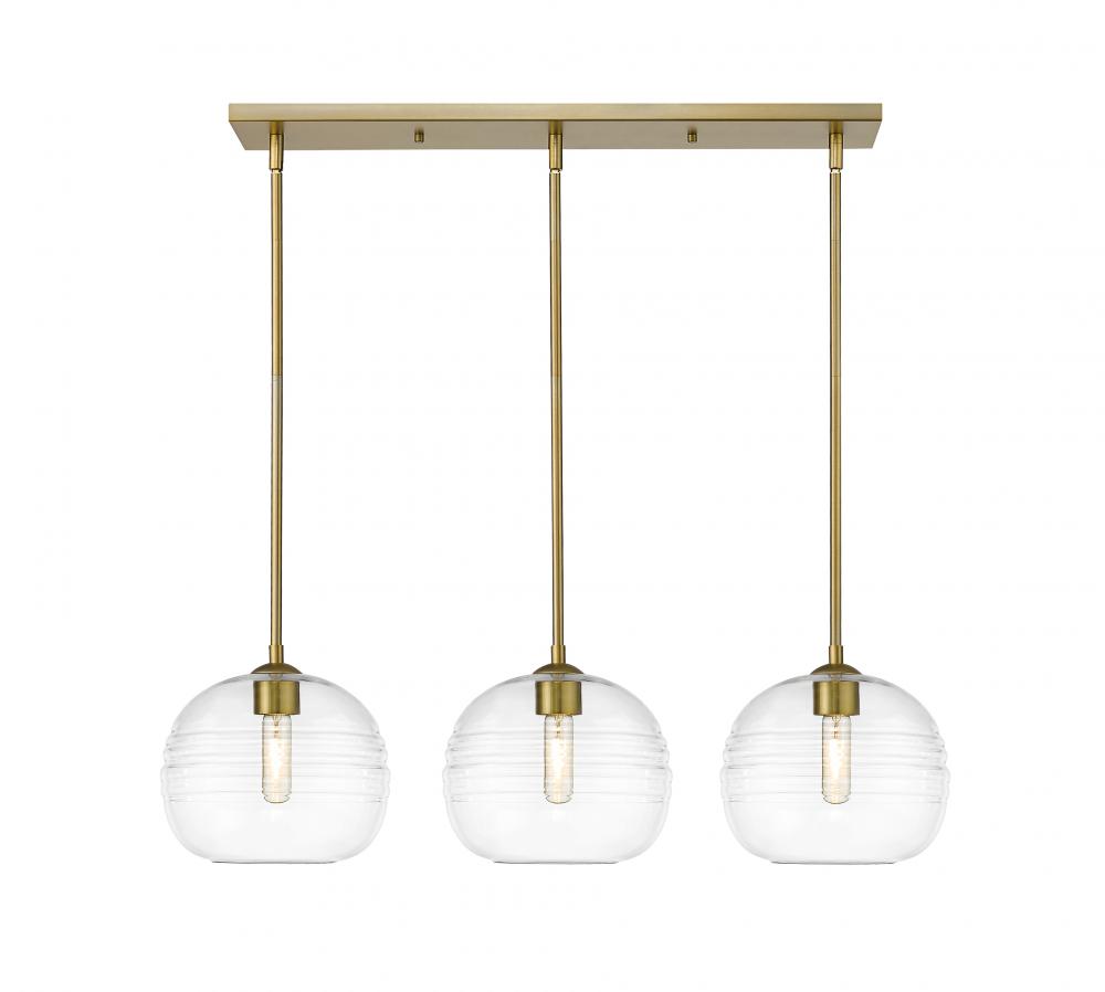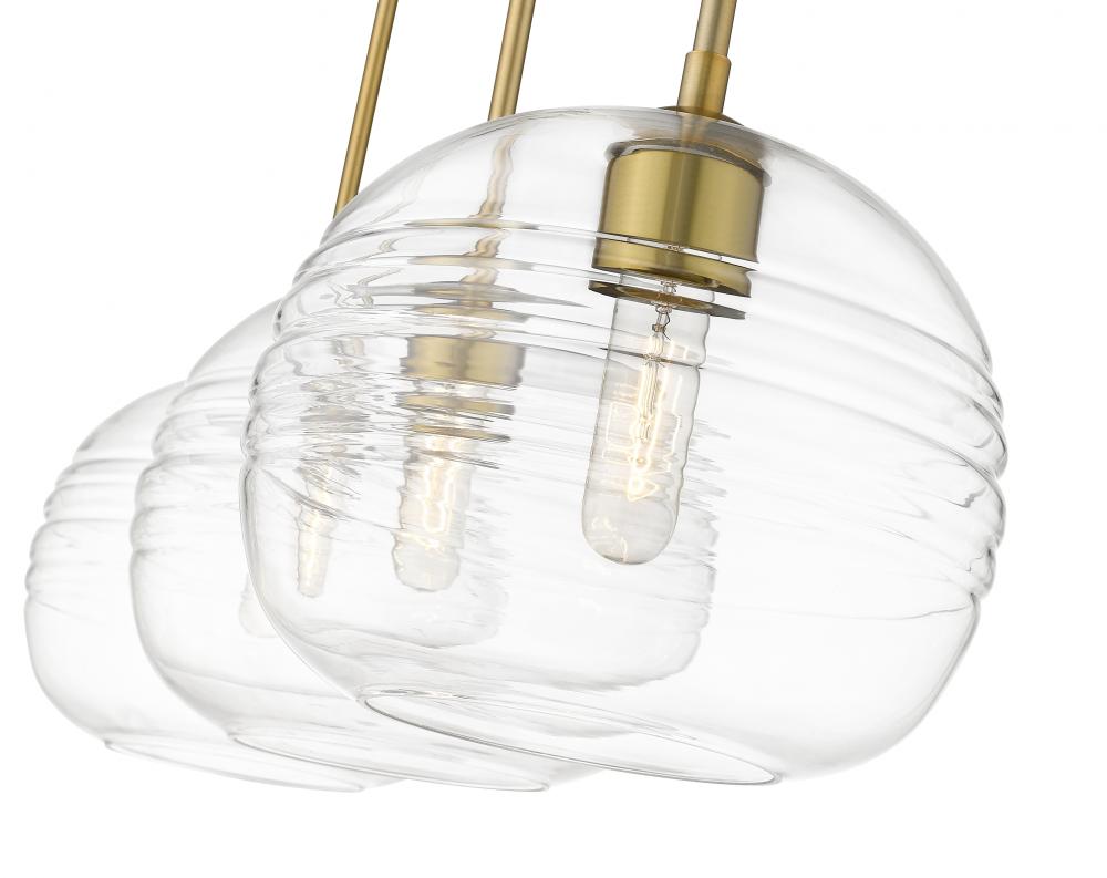 Express your modern aesthetic with this eye-catching billiard style three-light fixture. Grooved, rounded shades are made from clear glass, suspended from a sleek steel frame with an olde brass finish. The fixture brings a chic cutting edge to a contemporary kitchen or dining room.
