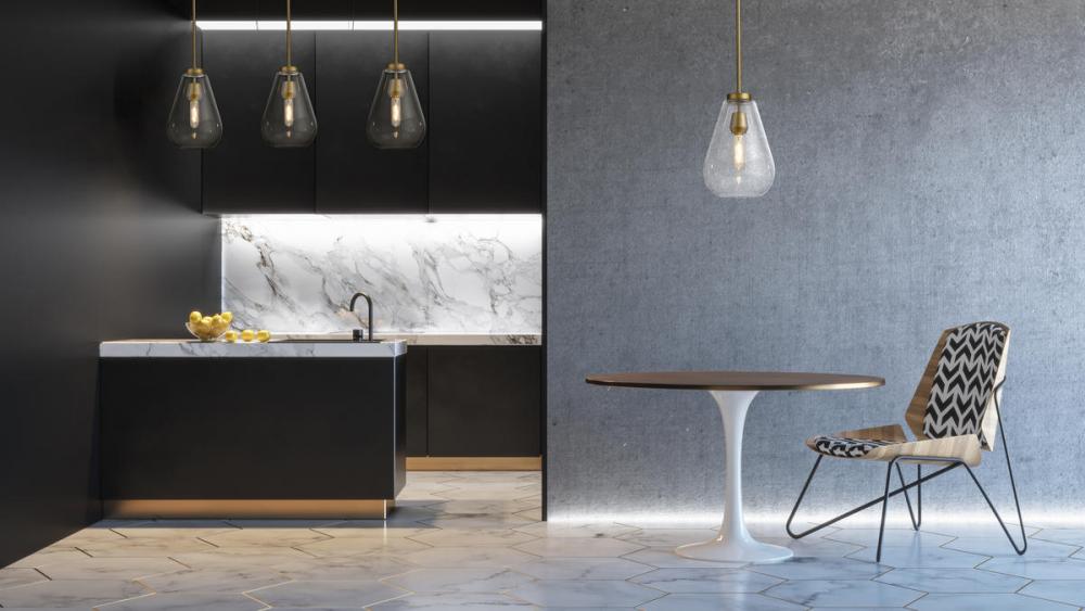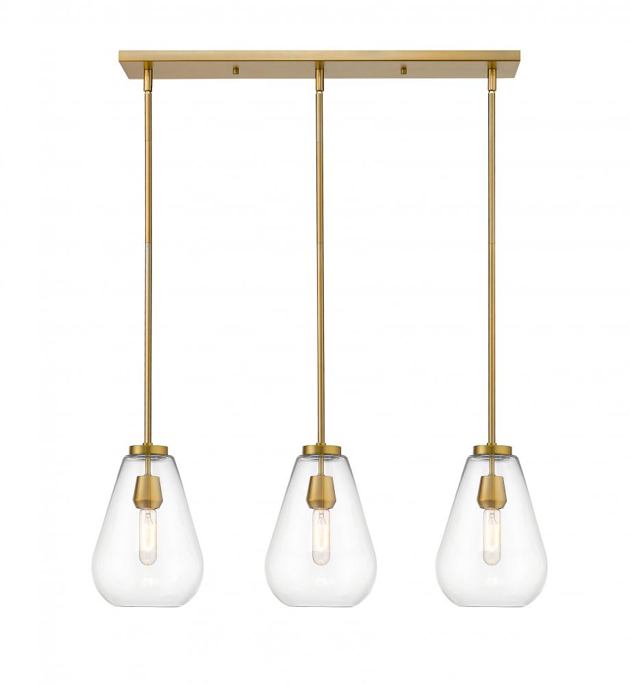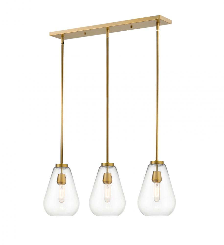 An eye-catching billiard style three-light fixture perfectly encapsulates the modern aesthetic. Tapered bell-shaped shades are made from clear glass, suspended from a sleek steel frame with an olde brass finish. The fixture brings a chic cutting edge to a contemporary kitchen or dining room.