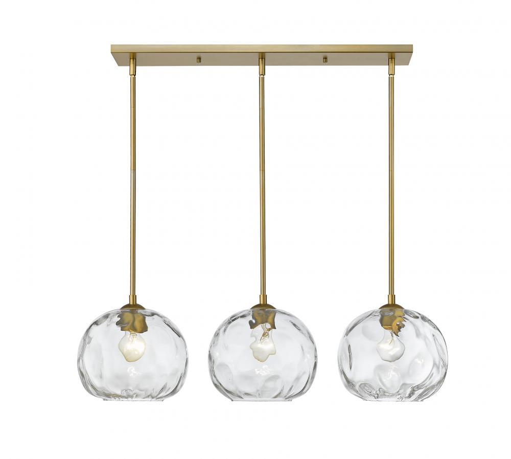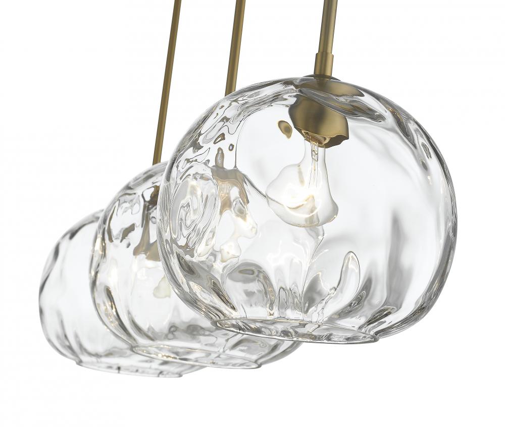 Define your modern space with the eye-catching, streamlined presence of this billiard style three-light pendant. Rounded shades are made from clear, water-textured glass, suspended from a sleek steel frame with an olde brass nickel finish. Your contemporary dining room or family space gets an instant boost with this sophisticated fixture.