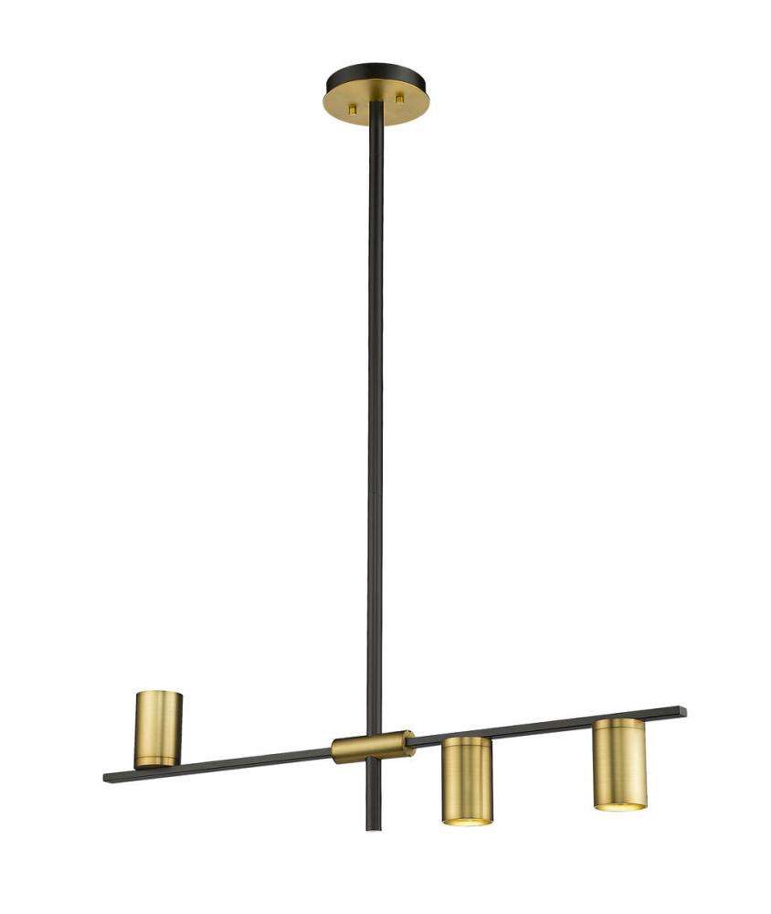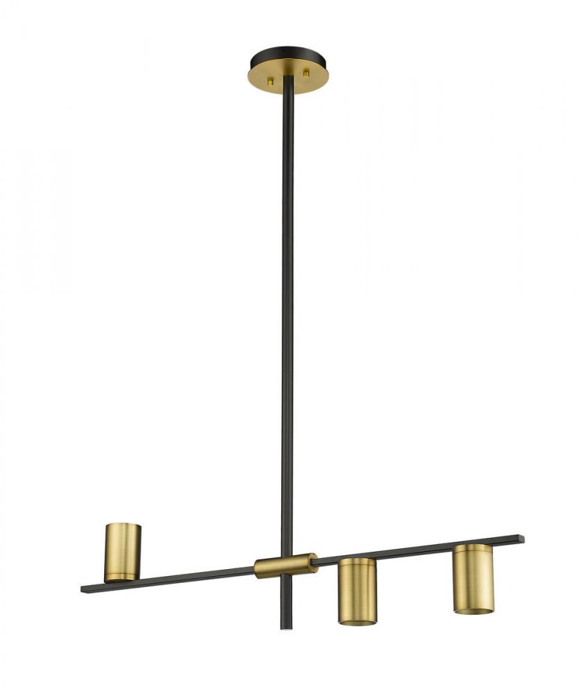 Turn conventional d?cor on its head with a storied Native American theme worked into a transitional light fixture meant for entertaining spaces. This three-light island and billiard light from the Calumet collection reflects primitive styling that blends matte black finish steel in a linear frame, arm, and canopy with carefully arranged olde brass finish steel shades. Enjoy uplighting and downlighting with a light fixture that offers dynamic personality.