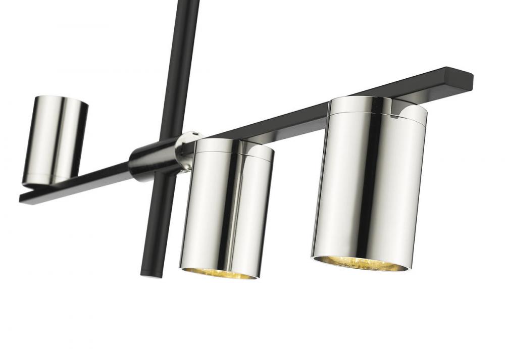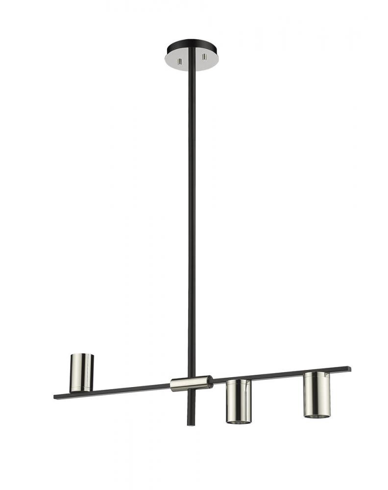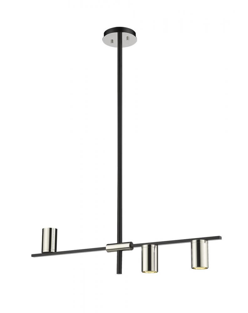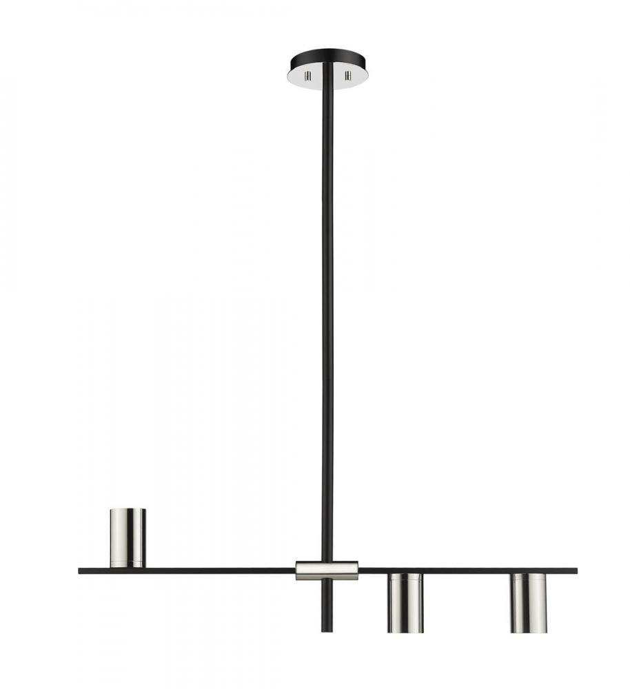 Turn conventional d?cor on its head with a storied Native American theme worked into a transitional light fixture meant for entertaining spaces. This three-light island and billiard light from the Calumet collection reflects primitive styling that blends matte black finish steel in a linear frame, arm, and canopy with carefully arranged polished nickel finish steel shades. Enjoy uplighting and downlighting with a light fixture that offers dynamic personality.