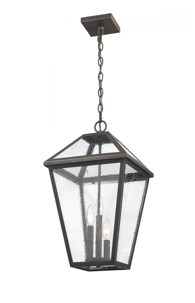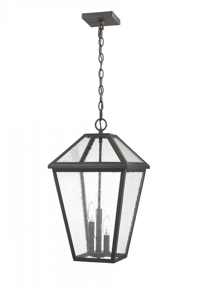 Illuminate an exterior front or back yard space with a classic fixture reflecting a charming village theme. Made from Rubbed Bronze metal and seeded glass panels, this generously sized three-light outdoor chain mount ceiling light brings a design-forward look to wrap up a tasteful and functional patio or porch space with soft lighting.