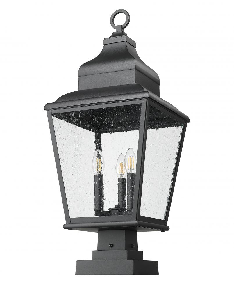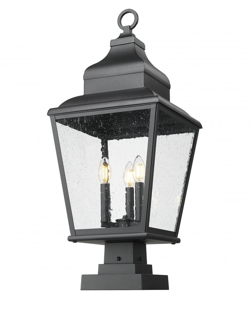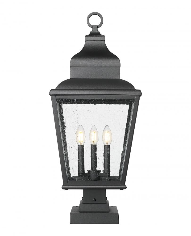 Modeled after a timeless lantern motif, this three-light outdoor pier-mounted fixture makes a romantic design statement in yard spaces and custom gardens. Soft sand black finish aluminum construction forms a gently tapered silhouette, with a bevy of ornate detailing and clear seedy glass panels. Interior candelabra-style bulb mounts infuse dimmable lighting to alter the mood of any space.