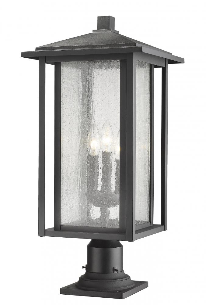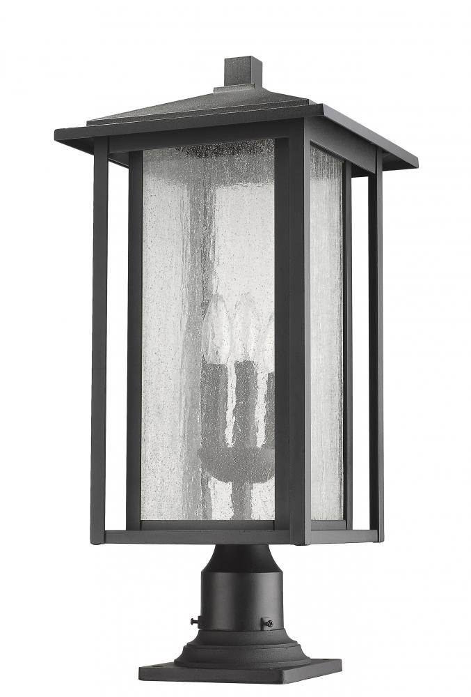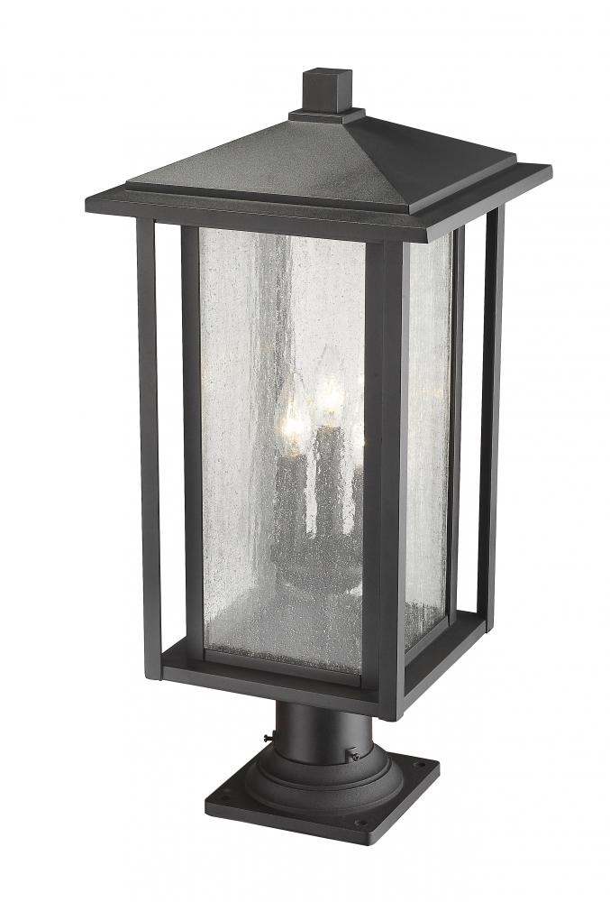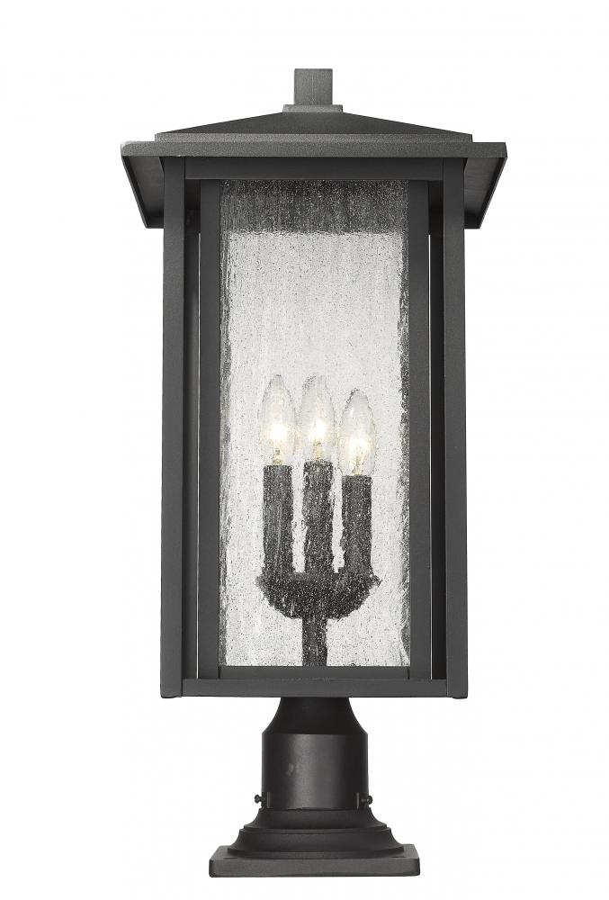 This elegant three-light outdoor pier mounted fixture features brilliant seedy glass that creates a watery effect. Boasting a contemporary lantern silhouette, this post light offers ample illumination at the head of a pathway or flanking a driveway.