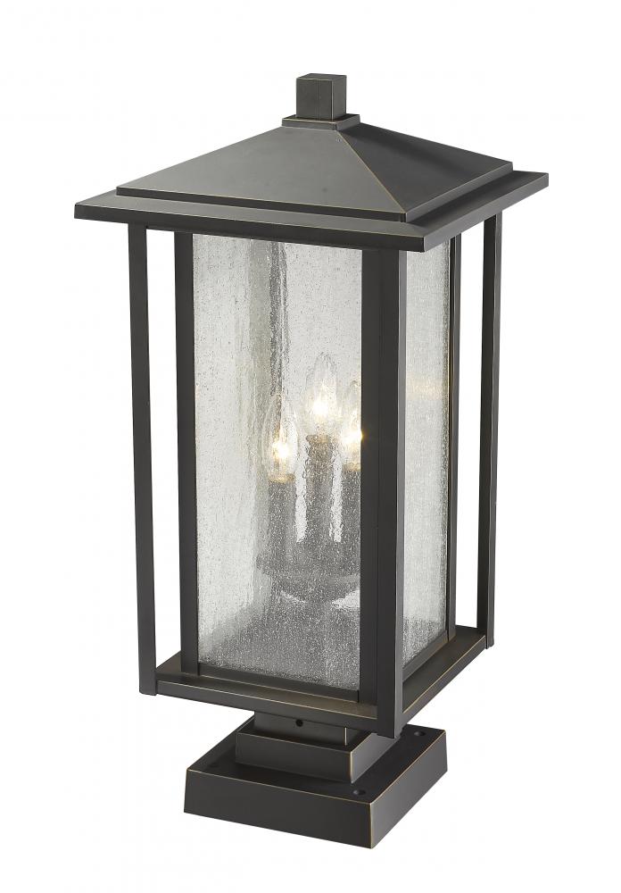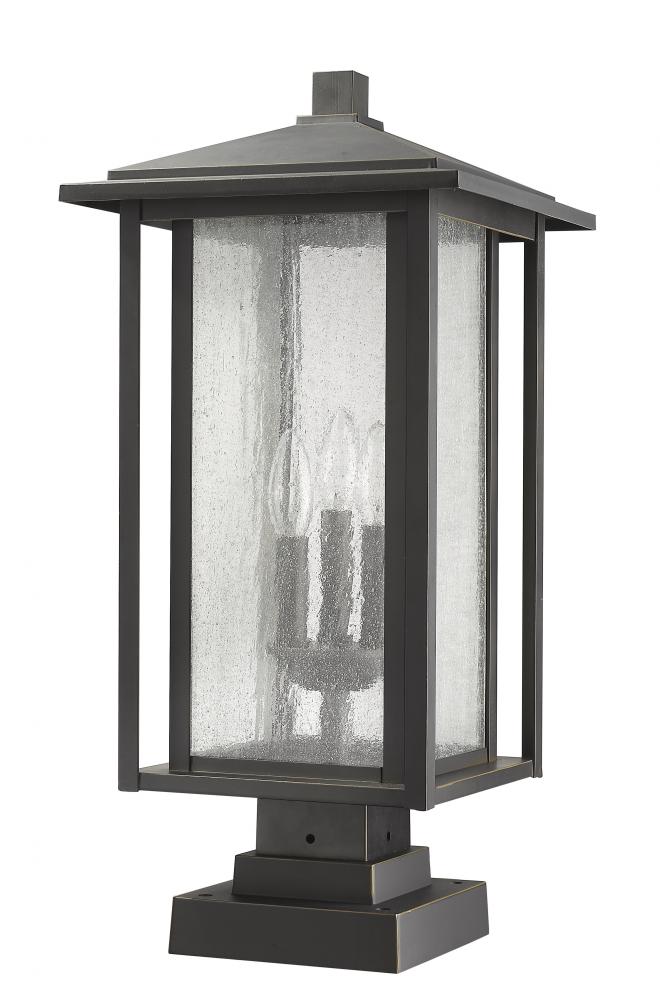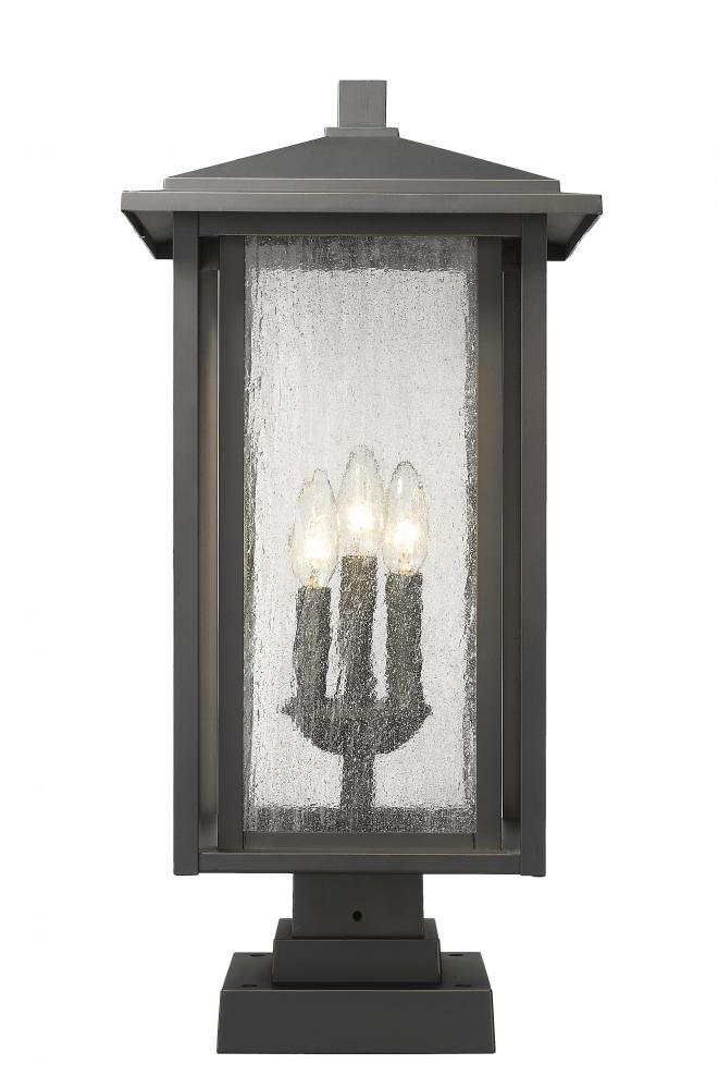 The best of modern and traditional converge in the classic design of this three-light outdoor pier mounted fixture. Gorgeous oil rubbed bronze provides the perfect finish for an aluminium dual frame and a candelabra-style bulb mount shielded by a romantic seedy glass shade.