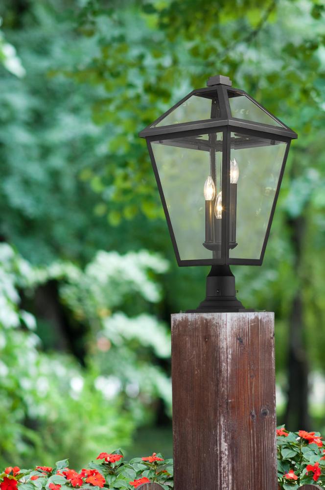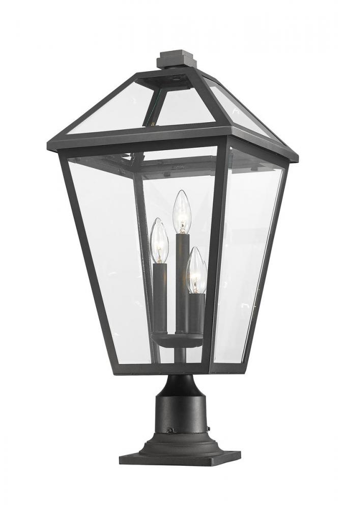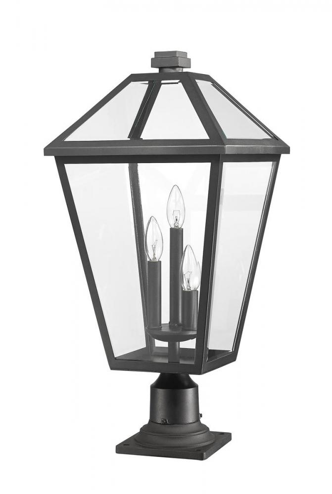 Illuminate an exterior front or back walkway with a classic fixture reflecting a charming village theme. Made from Midnight Black metal and clear beveled glass panels, this three-light outdoor pier mounted fixture delivers a charming upgrade with industrial-inspired attitude and a cage silhouette thats perfect for lower-level gardens and walkways.