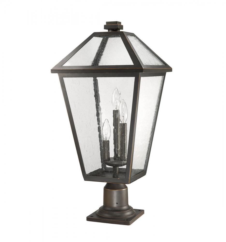 Illuminate an exterior front or back walkway with a classic fixture reflecting a charming village theme. Made from Rubbed Bronze metal and seedy glass panels, this three-light outdoor pier mounted fixture delivers a charming upgrade with industrial-inspired attitude and a cage silhouette thats perfect for lower-level gardens and walkways.