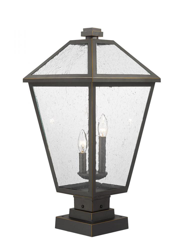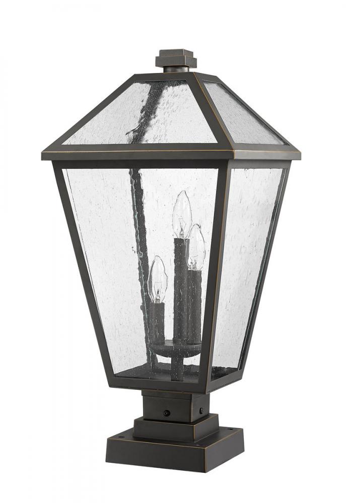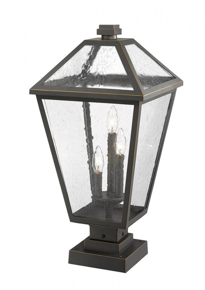 Light up an exterior garden or walkway with a classic fixture reflecting a charming village theme. Made from Rubbed Bronze finish metal and seedy glass panels, this three-light outdoor pier mounted fixture delivers a fresh upgrade with a square pier mount and an artistic industrial-inspired aesthetic.