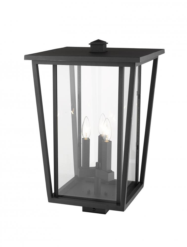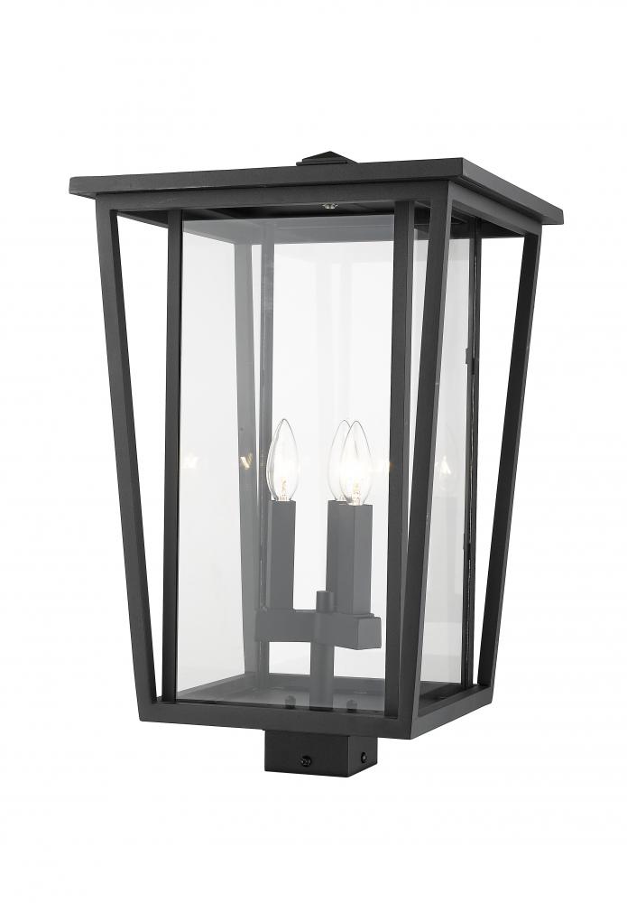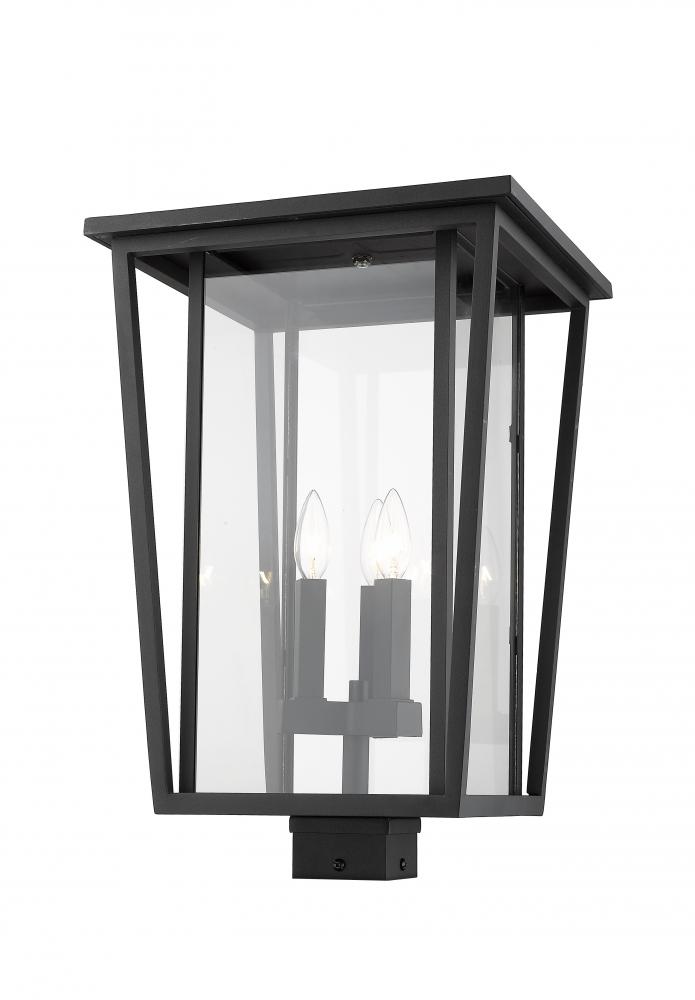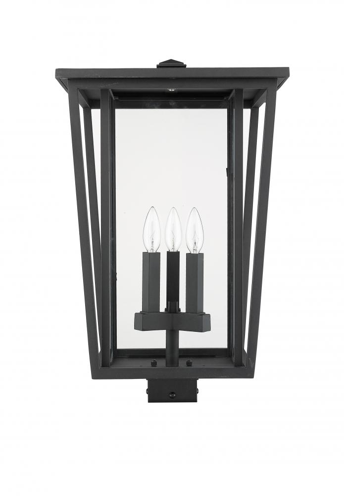 Capture the personality of fashionable outdoor design. A bold black finish frame offers a dramatic feel to this outdoor post lantern, showing off a three-light candelabra bulb base tucked behind a clear glass shade.