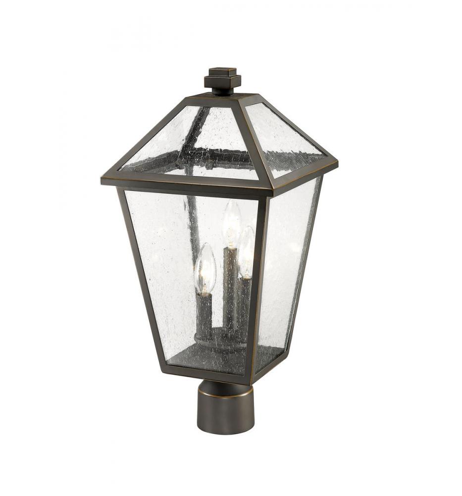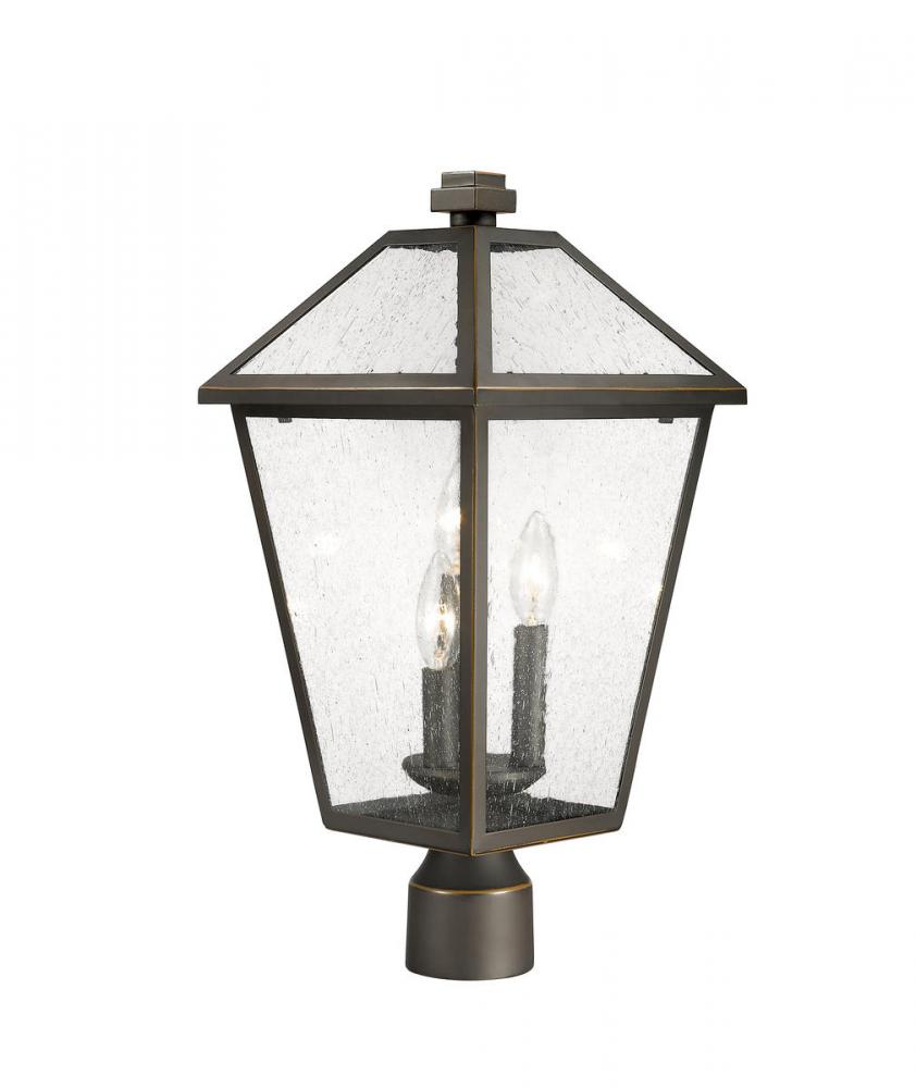Illuminate an exterior front or back walkway with a classic fixture reflecting a charming village theme. Made from Rubbed Bronze metal and seedy glass panels, this three-light outdoor post mount fixture delivers a charming upgrade with industrial-inspired attitude that tops a custom chosen post.