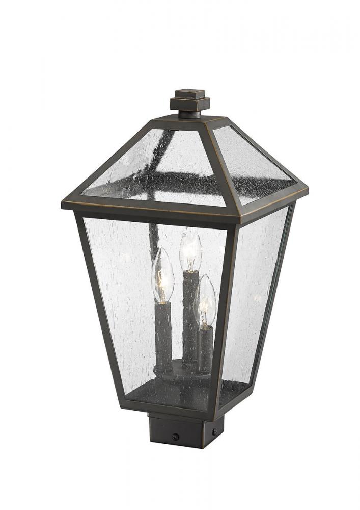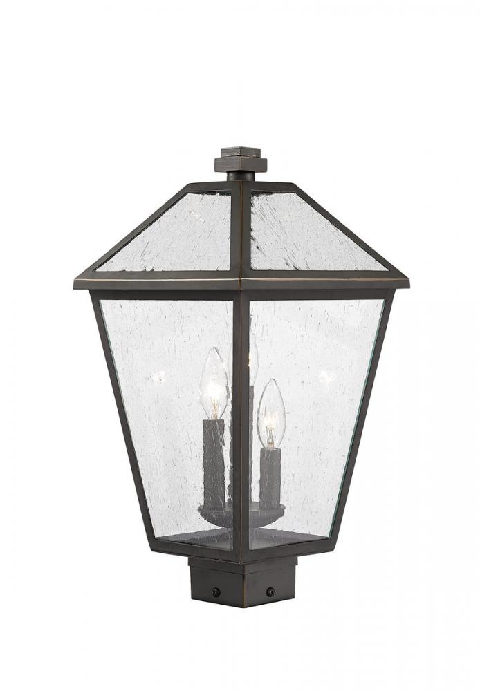 Illuminate an exterior front or back walkway with a classic fixture reflecting a charming village theme. Made from Rubbed Bronze metal and seedy glass panels, this three-light outdoor post mount fixture delivers a charming upgrade with industrial-inspired attitude that tops a squared post frame.