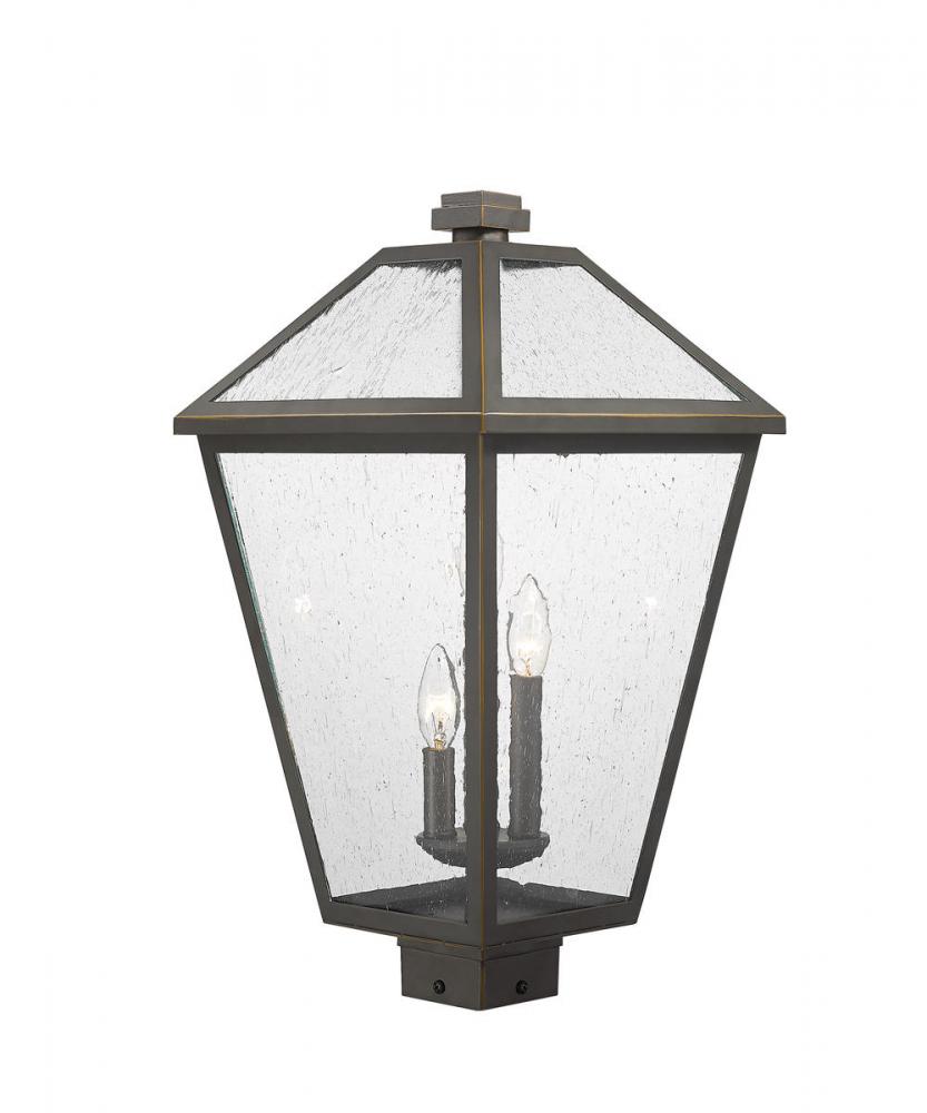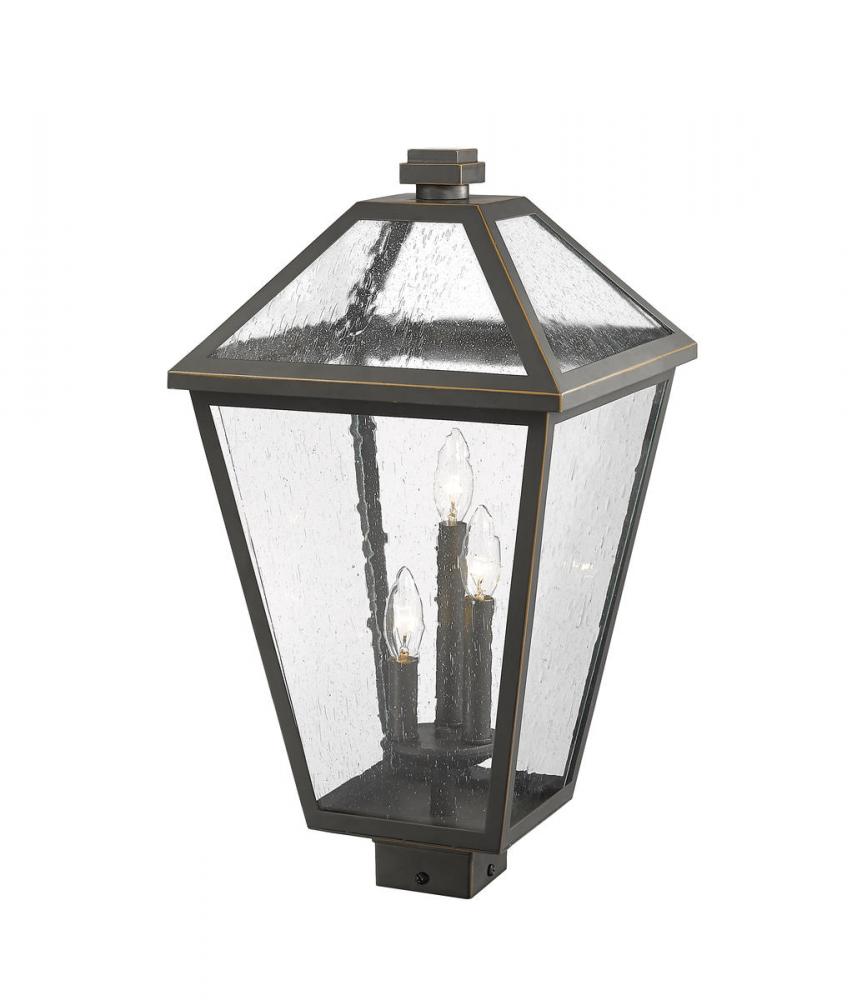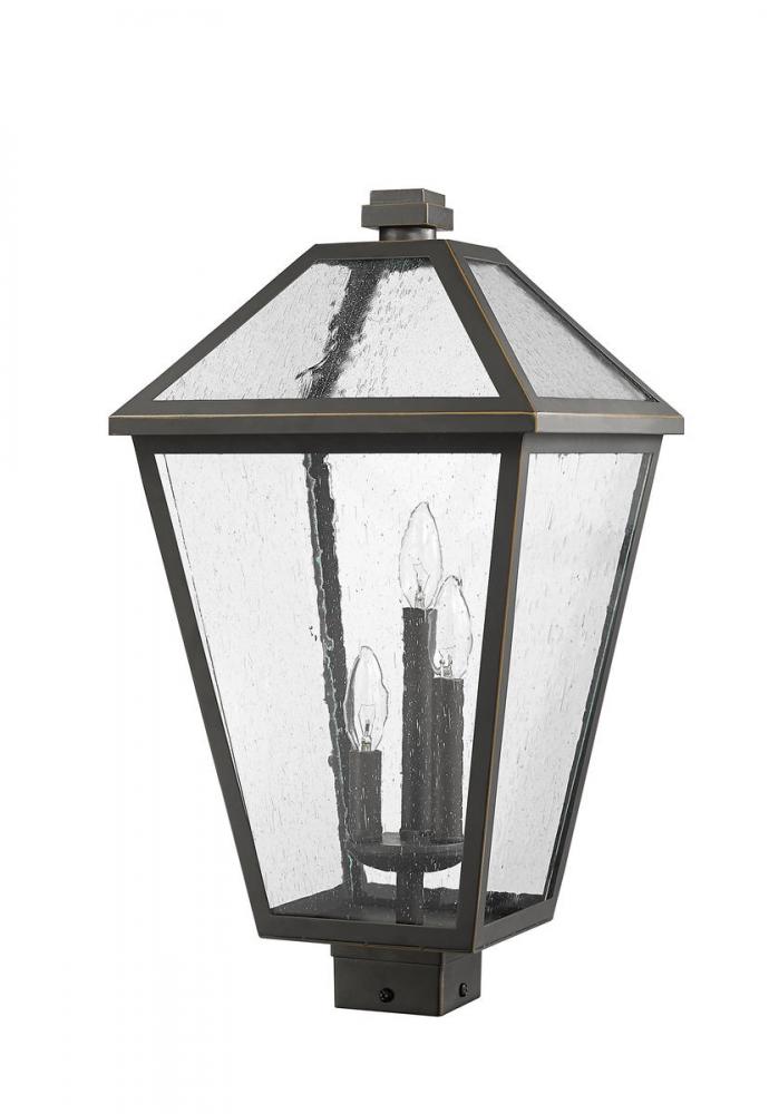 Light up an exterior front or back walkway with a classic fixture reflecting a charming village theme. Made from Rubbed Bronze metal and seedy glass panels, this three-light outdoor post mount fixture delivers a fresh upgrade with a square post mount and an artistic industrial-inspired aesthetic.