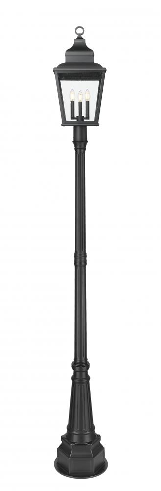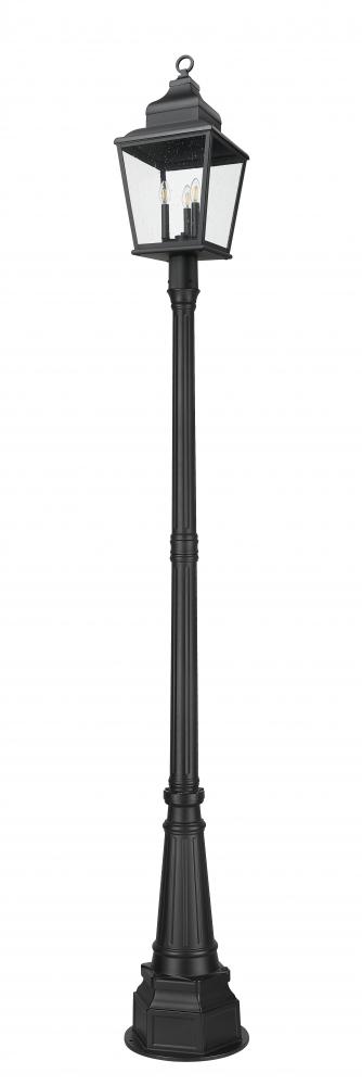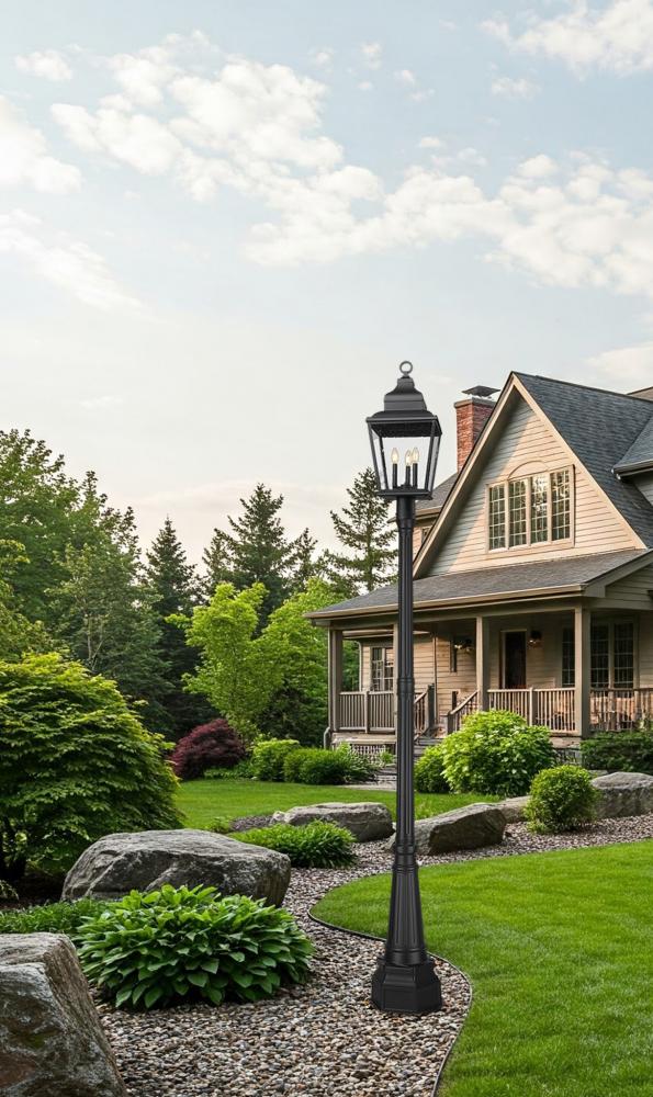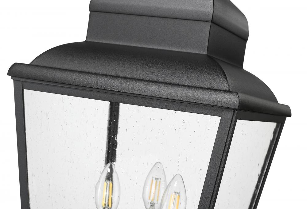 Enhanced with intricate detail, this three-light outdoor post mount fixture brings an elegant motif to front yards, walkways, and other exterior spaces. Soft sand black finish aluminum framing welcomes clear seedy glass panels offering an unobstructed view of charming candelabra-style bulb mounts, perfect for assembling a village-like motif. Dimmable lighting adds convenient adjustments of illumination levels for around-the-clock purposes.