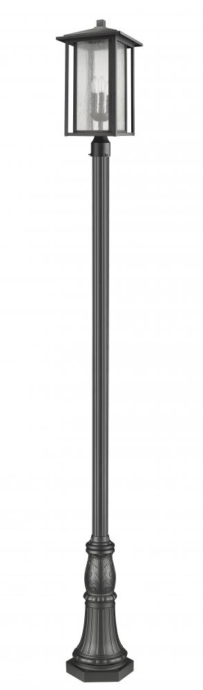 Bring a beautifully stylish look to an exterior space with this black finish three-light outdoor post-mounted fixture. Sultry curved detailing adds an artistic touch to an aluminium body and dual frame housing a seedy glass shade that shields a romantic candelabra bulb base.