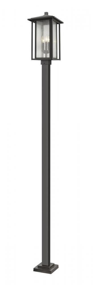 Conquer challenges of function and design with this oil rubbed bronze finish three-light outdoor post mounted fixture. A statuesque aluminium body and dual frame calls attention to a seedy glass shade, enhancing the dramatic effect of a candelabra-style bulb mount.