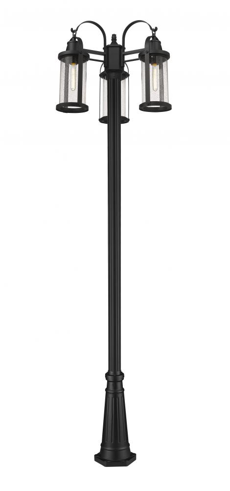 This three-light outdoor post mounted fixture can revitalize the look of your porch or patio space with its lantern-like features and classic yet modern character. Black aluminum composes the elegant, subtly flared post and caps the top and bottom of the two cylindrical shades, finished with clear seedy glass. LED bulbs effectively illuminate your space, making this a clear choice for sleek, energy-efficient exterior lighting.