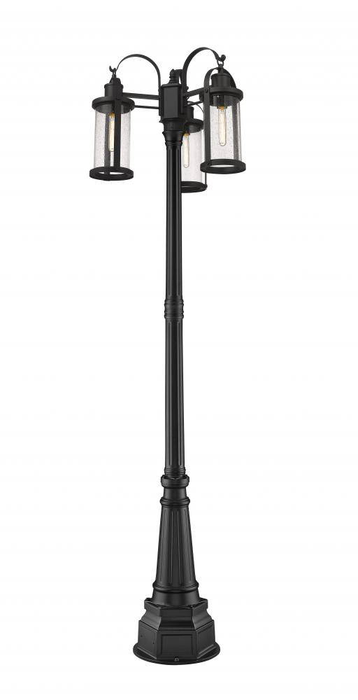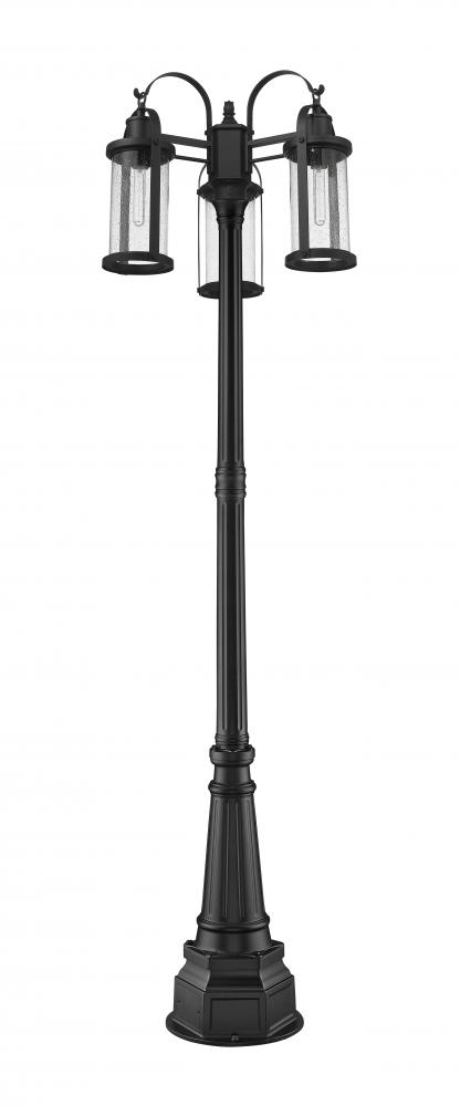 This three-light outdoor post mounted fixture can revitalize the look of your porch or patio space with its lantern-like features and classic yet modern character. Black aluminum composes the elegant, subtly flared post with its sturdy hexagonal base, and caps the top and bottom of the two cylindrical shades, finished with clear seedy glass. LED bulbs effectively illuminate your space, making this a clear choice for sleek, energy-efficient exterior lighting.