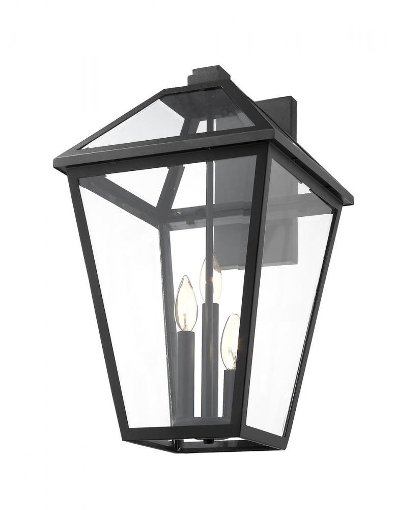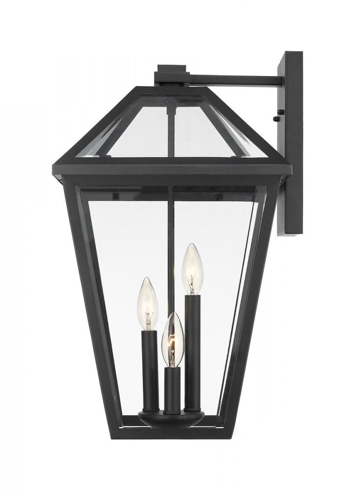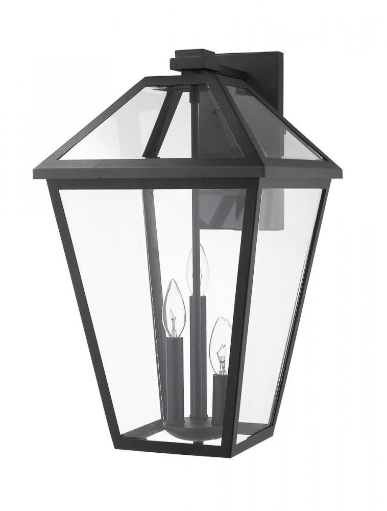 Illuminate an exterior front or back yard space with a classic fixture reflecting a charming village theme. Made from Midnight Black metal and clear beveled glass panels, this three-light outdoor wall sconce brings a design-forward look to wrap up a tasteful and functional yard space.