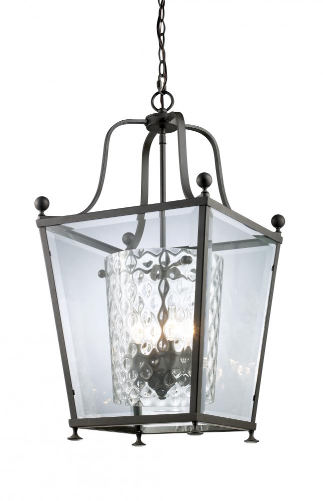 This pendent fixture maybe small in size but it is big on looks. Bronze detailing is complimented with a modern looking clear beveled glass, while delicate clear hammered glass provides a warm tenderness typically found with traditional lighting style. This combination ensures that no matter what room, this fixture will be a perfect fit.