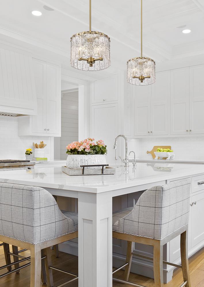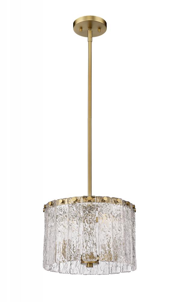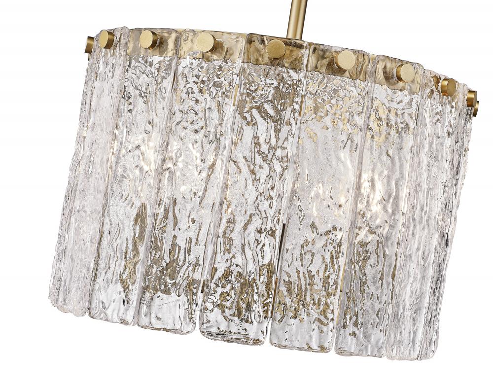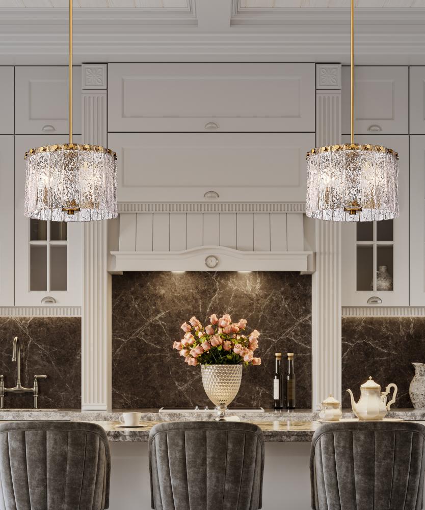 The gallery influence of this decadent fixture becomes apparent from the start, offering a romantic bridge between industrial and artistic. The Glacier round three-light pendant features clear textured glass panels that emulate melting ice, an extraordinary effect with dramatic impact in a foyer or main living area. Modern gold finish steel is placed as a crown frame, adding a consistency in palette and motif and embellishing with a blend of glam and industrial grit.