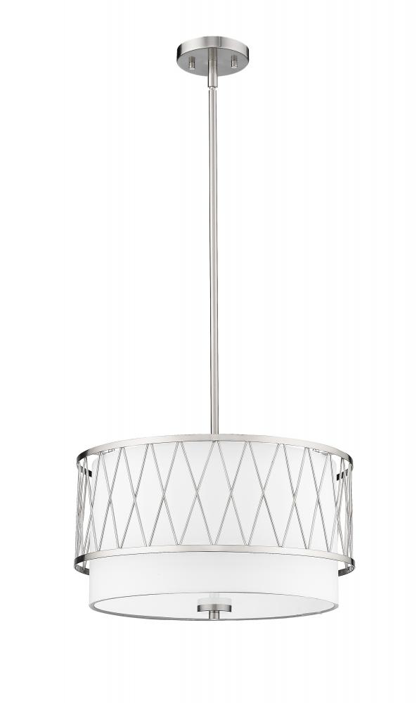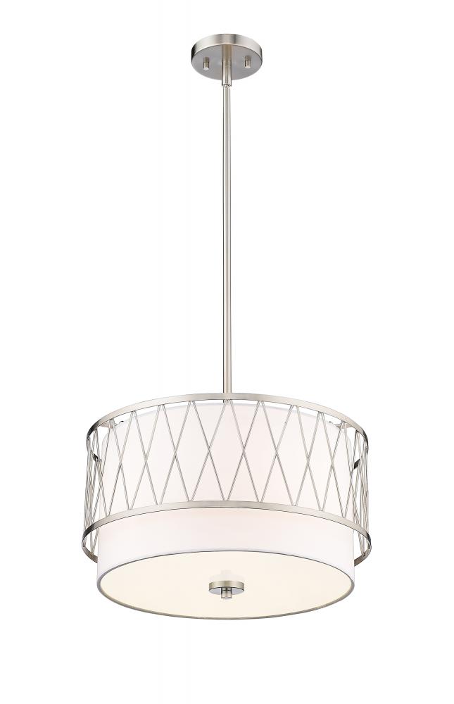 A lustrous brushed nickel finish cage with slim diagonal pattern sweep across this modern three-light pendant, offering a retro-inspired Mid-Century Modern feel to a space. Tucked inside this sleek pendant is a white fabric drum shade in a tiered multi-level design that offers an elegant depth to small kitchen breakfast nooks, entryway foyers and more interior spaces where a glamorous metallic touch is a must.