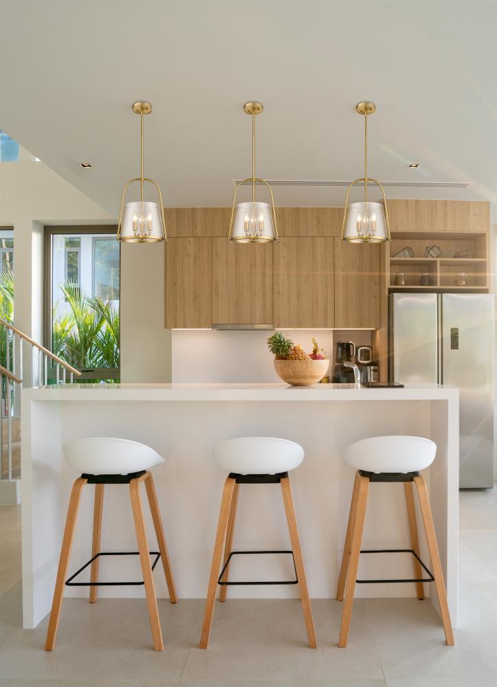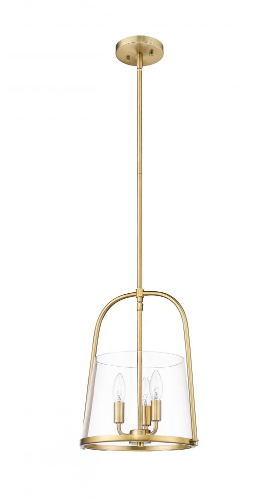 A bit of nautical charm and a decadent mix of materials complement this three-light pendant from the Archis collection, delivering transitional style elements perfect for any space. Framing of modern gold finish steel emulates an open bell silhouette with a romantic clear glass shade positioned at its bottom. Candelabra lamping changes up the mood with a softening effect, making this pendant a superb option for a trending minimalist modern or transitional setting.