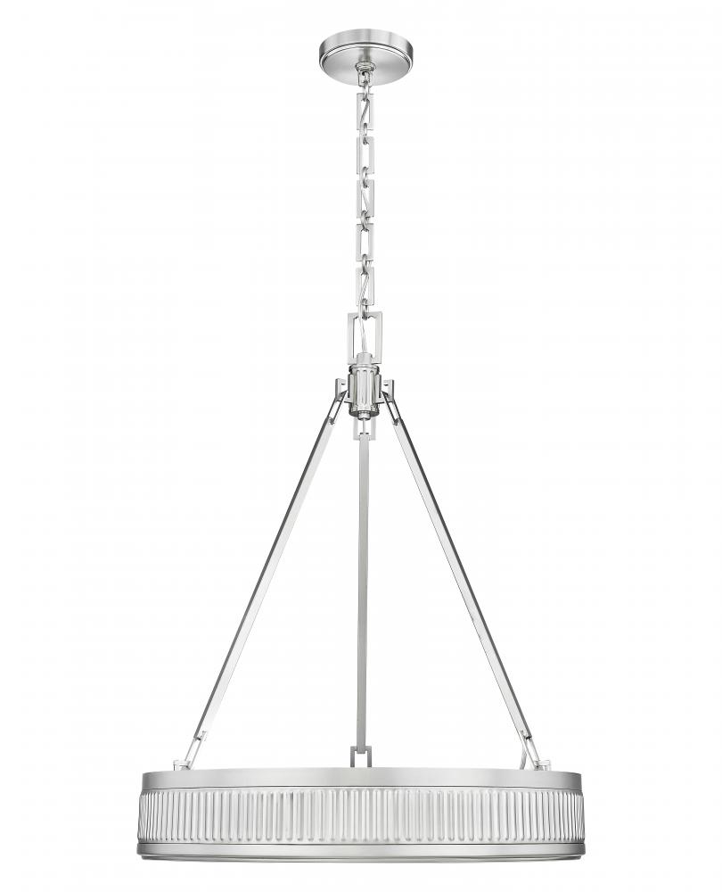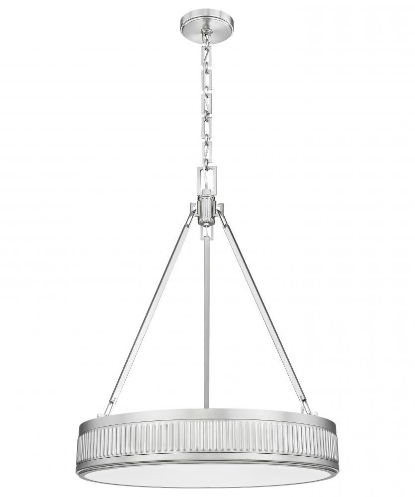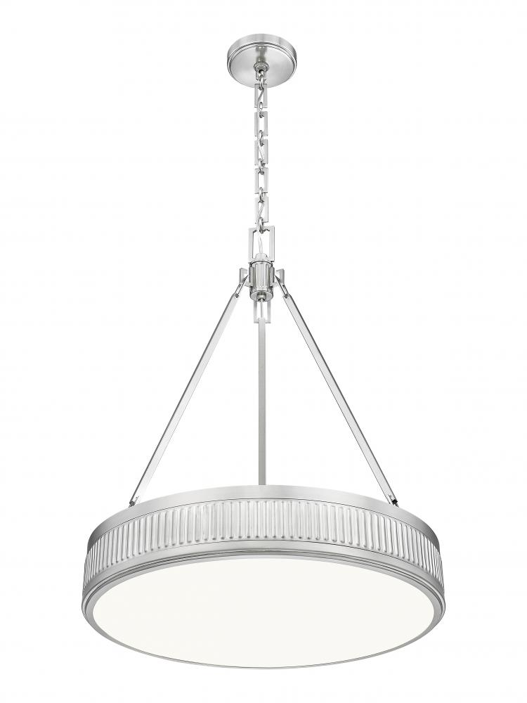 Urbane sophistication is the watchword in this modern three-light LED pendant. From the Quinn collection, its an updated version of mid-century charm, pairing a shallow drum with fluted bands that create superb texture and dimensionality. Its satin nickel finish complements in any setting, while a Z-Lite EZ change LED module tucked within is light color selectable, dimmable, and energy efficient.