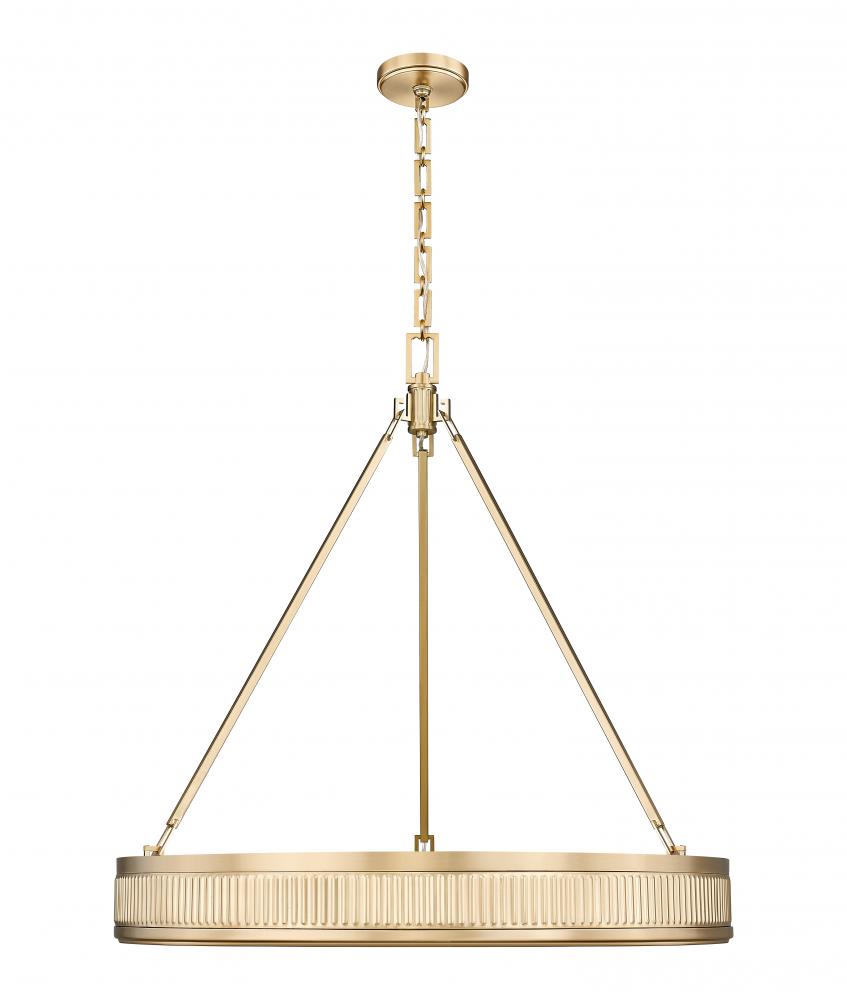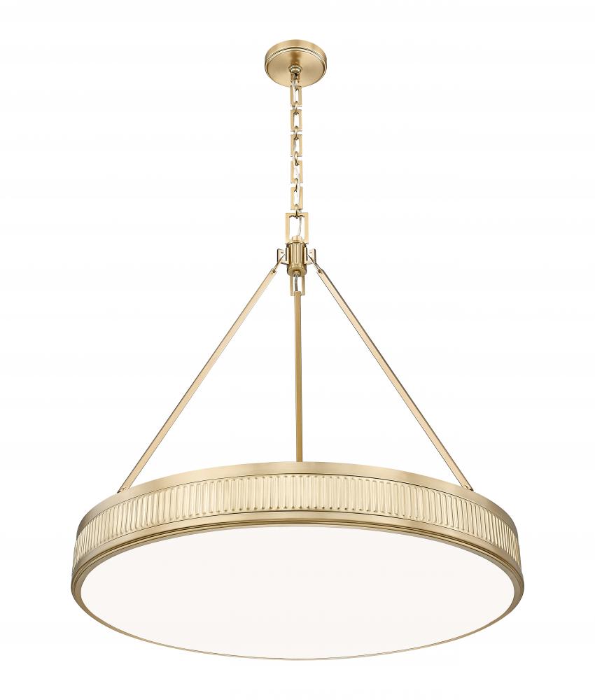Generous in profile, this modern three-light drum pendant radiates sophistication and mid-century inspired charm. Fluted bands encircle its light and suspension, adding texture and richness to a warm modern gold finish. Tucked within the shade is a Z-Lite EZ change LED module that offers light color selectability, dimming capabilities and energy efficiency perfect for living or dining room.