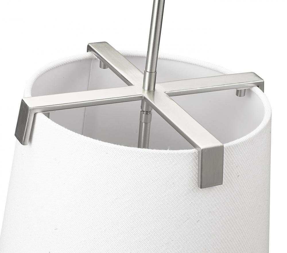 Indulge in a modernized version of traditional lighting with a three-light pendant delivering graceful and fluid design elements. Brushed nickel finish steel framing with clips attaches to a bright white linen fabric shade, offering low-profile elegance, as candelabra lights diffuse illumination beautifully. This fixture is dimmable, creating mood lighting and efficient functionality.